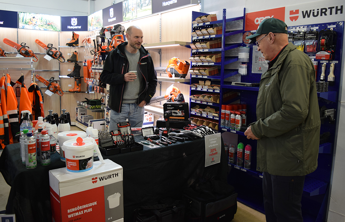 Dennis Palmqvist, Håkans Fastighetsservice, möter upp i butiken och berättade vad som var på gång. – I kväll bjuder Södra in sina medlemmar till en medlemskväll och de har valt att förlägga den hos oss för första gången, vilket vi är glada för. Vi har också passat på att bjuda hit några av våra samarbetspartner, bland annat ett ny leverantör och samarbetspartner till oss, Würth. De är leverantörer av verktyg, bult, skruv och sådant som hemmafixaren behöver. Det har inte funnits här tidigare så det känns bra. I samband med ny samarbetspartner har vi har satt upp lite nya hyllor och gjort butiken lite luftigare.