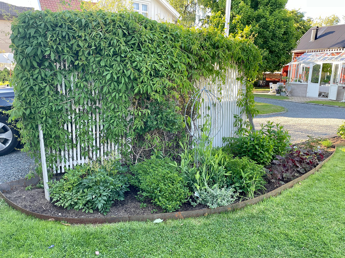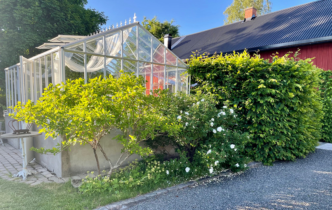 Trädgården är omsorgsfullt anlagd med grusgångar, perennrabatter och ett vackert vitt växthus. Innanför växthuset och trädäcket i det gamla faluröda lilla huset har familjen ett mysigt uterum med en stenugn för pizzabakning. Här förvarar de också sina medelhavsväxter under vintern. Man kan ju ana att det ligger några timmar och arbete bakom den här trädgården…
