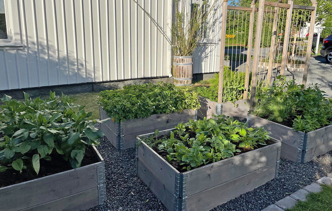 I odlingslådorna växer diverse blommor och grönsaker