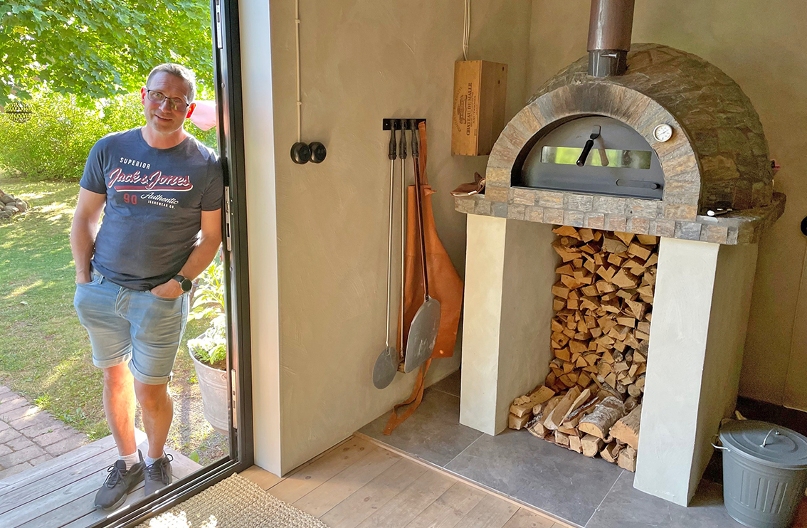 Pierre vid sin pizzaugn