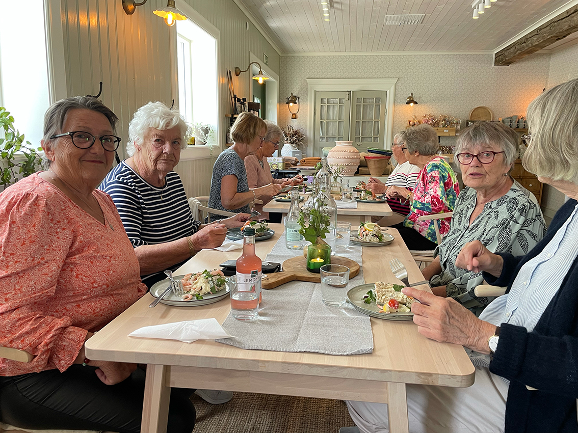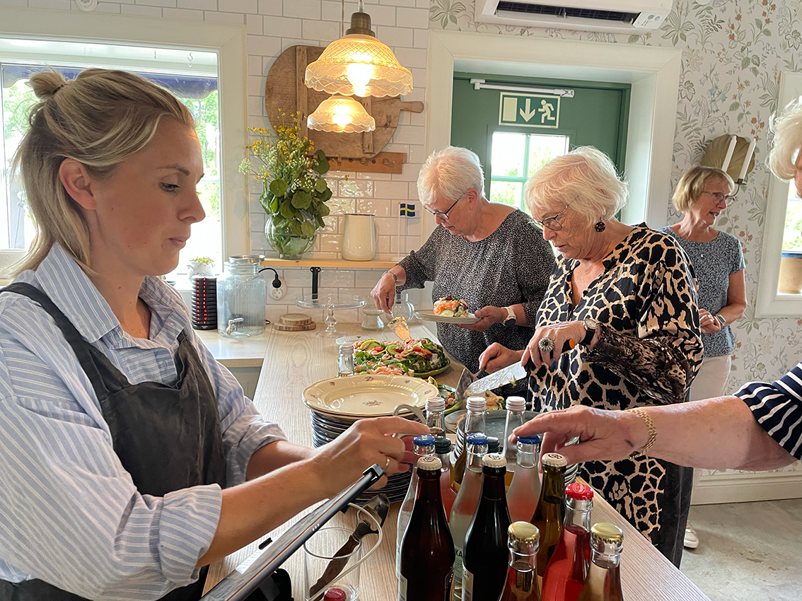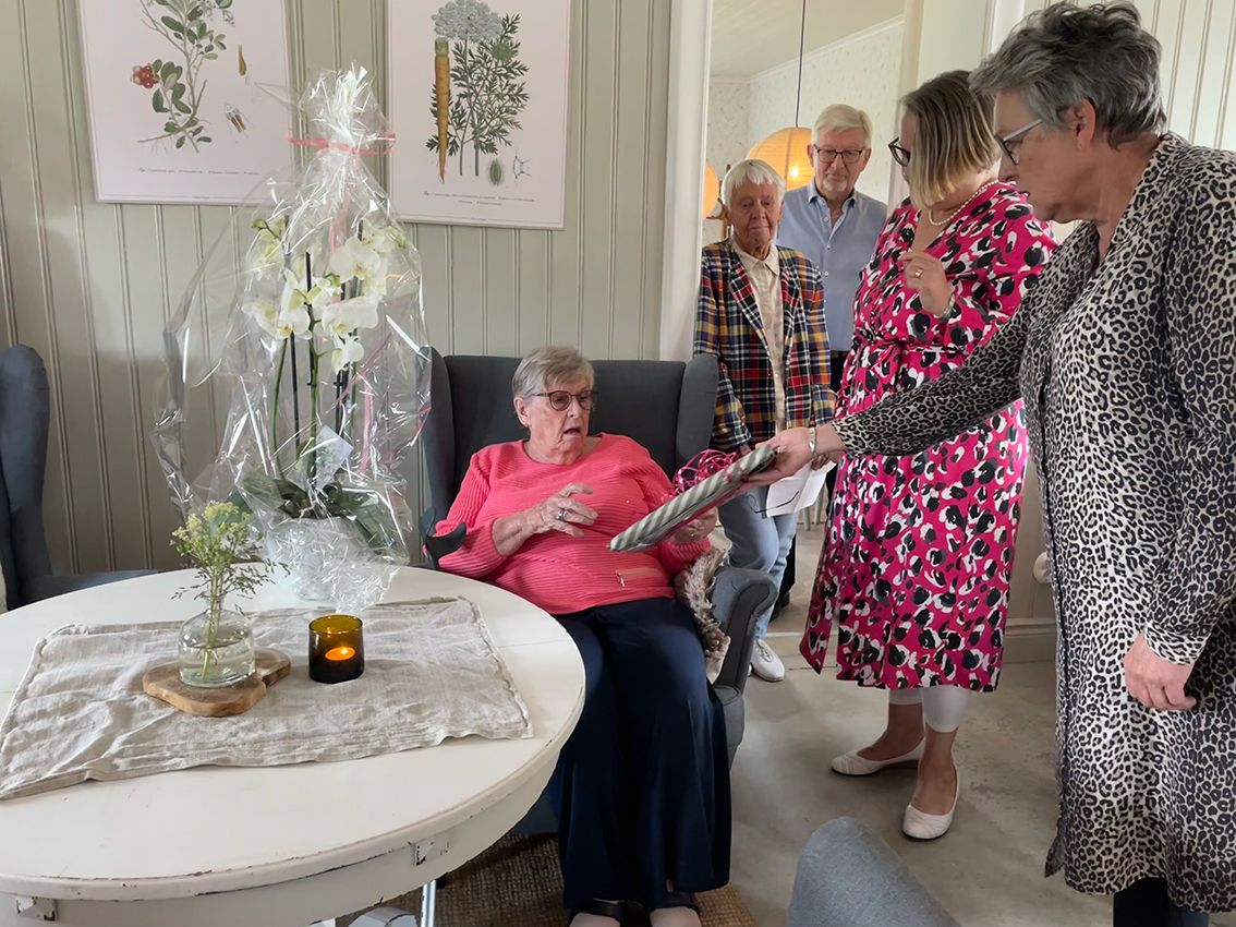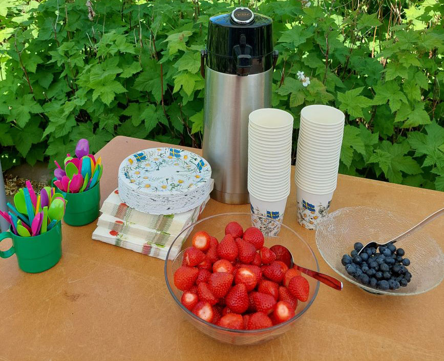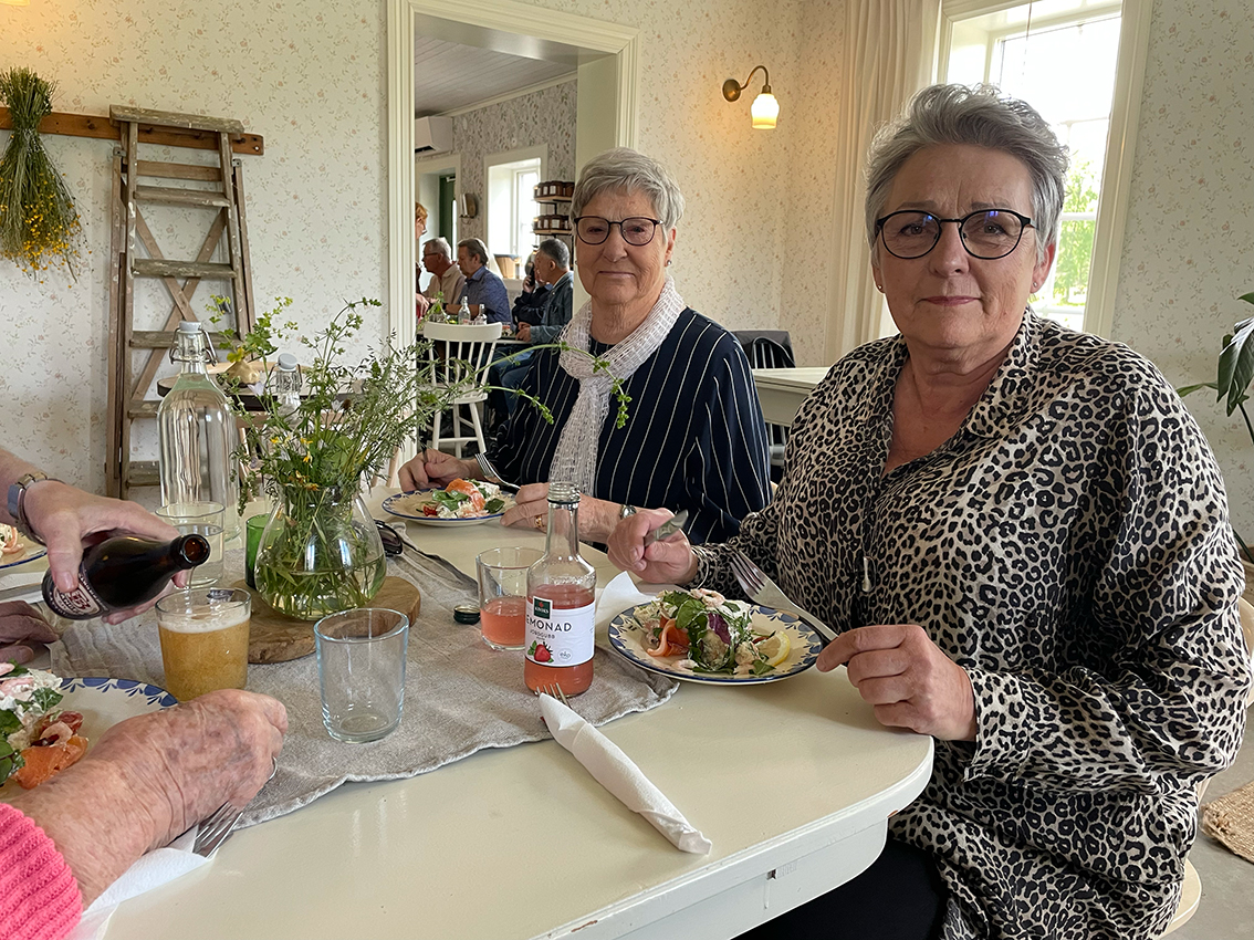 På sommarfesten serverade gårdscaféet smarrig smörgåstårta och andra godsaker till kaffet. Anna Vingrahn som är ordförande i Röda korset hälsade välkommen och tackade hela skaran på över 30 personer som var med på dagens festligheter. Gunilla blev avtackad, med blomma och present, för det enorma arbetet som hon har bidragit med genom åren och Birgitta Mörk höll ett kort tal.