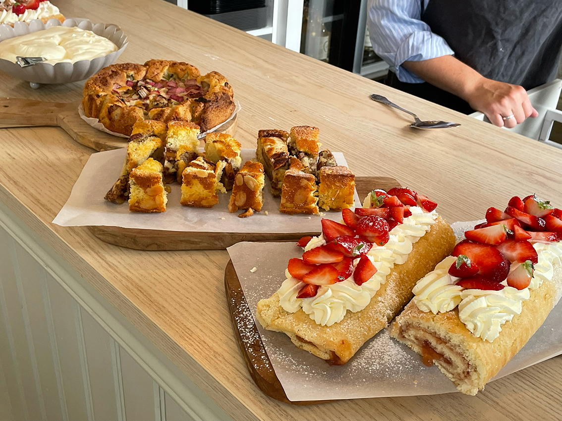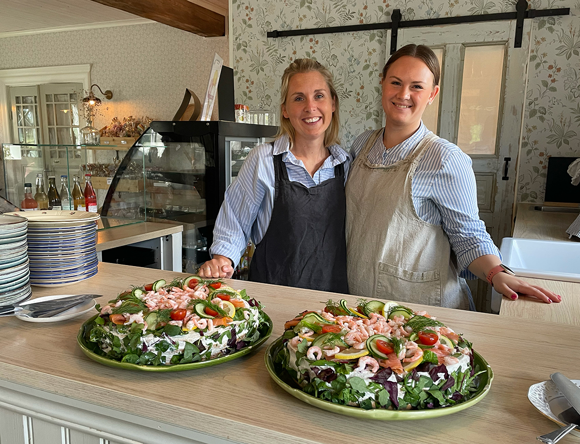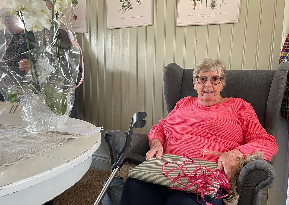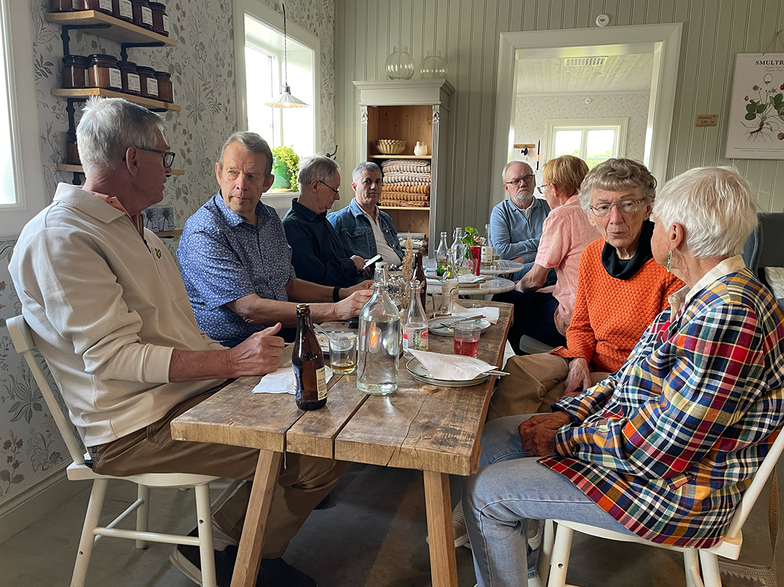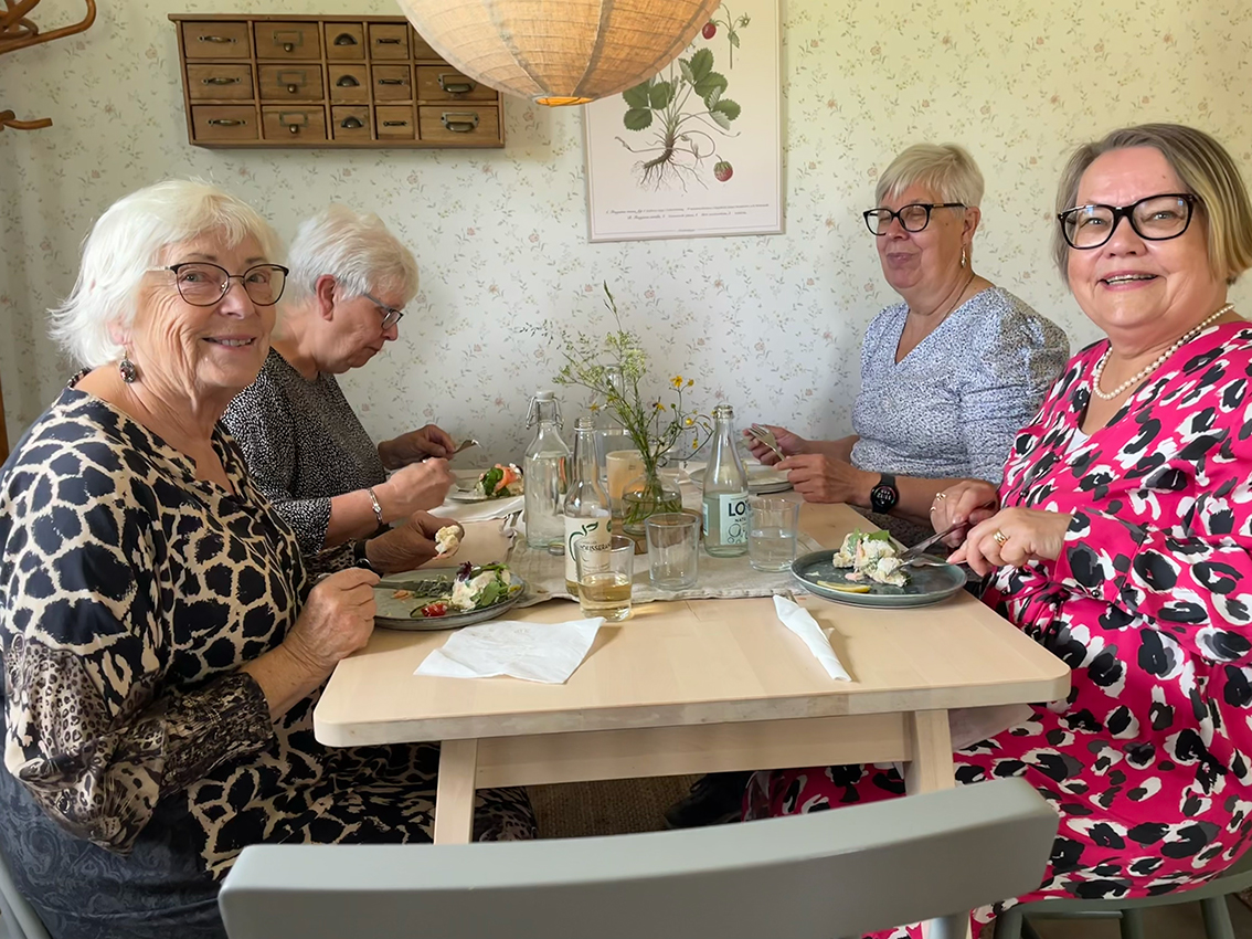 På sommarfesten serverade gårdscaféet smarrig smörgåstårta och andra godsaker till kaffet. Anna Vingrahn som är ordförande i Röda korset hälsade välkommen och tackade hela skaran på över 30 personer som var med på dagens festligheter. Gunilla blev avtackad, med blomma och present, för det enorma arbetet som hon har bidragit med genom åren och Birgitta Mörk höll ett kort tal.