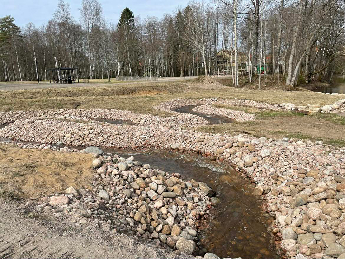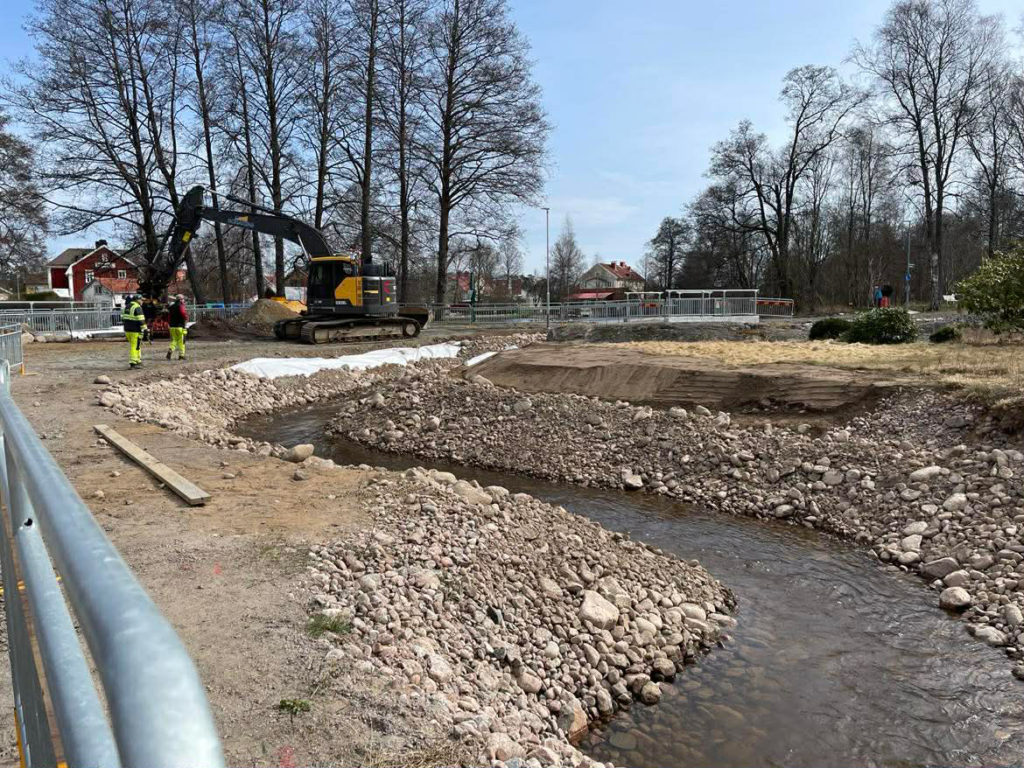 En fiskvandringsbäck som går upp mot dammen. Det är vad Johan Josefsson och Arvid Larsson färdigställde under gårdagen när de placerade ut större stenar där fiskar ska kunna stanna bakom och vila, på motströmsvägen upp till dammen.