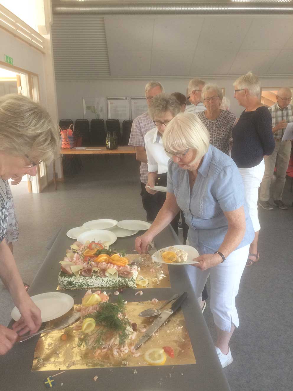 Smörgåstårta och kaffe intogs och därefter informerade Alf Carlsson om månadsmötet i Byarums hembygdsgård den 9 augusti. Lennart Andersson berättade om studiecirkeln ”Lär känna din hembygd” som fortsätter den 26 juni med samling vid Missionskyrkan.