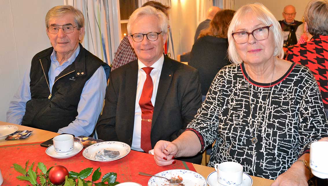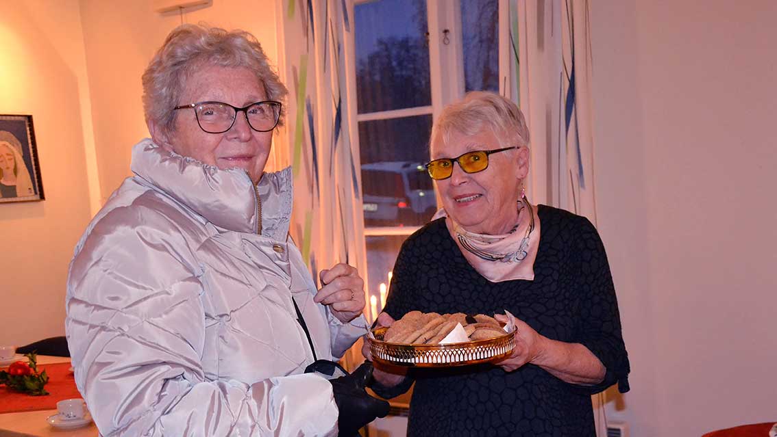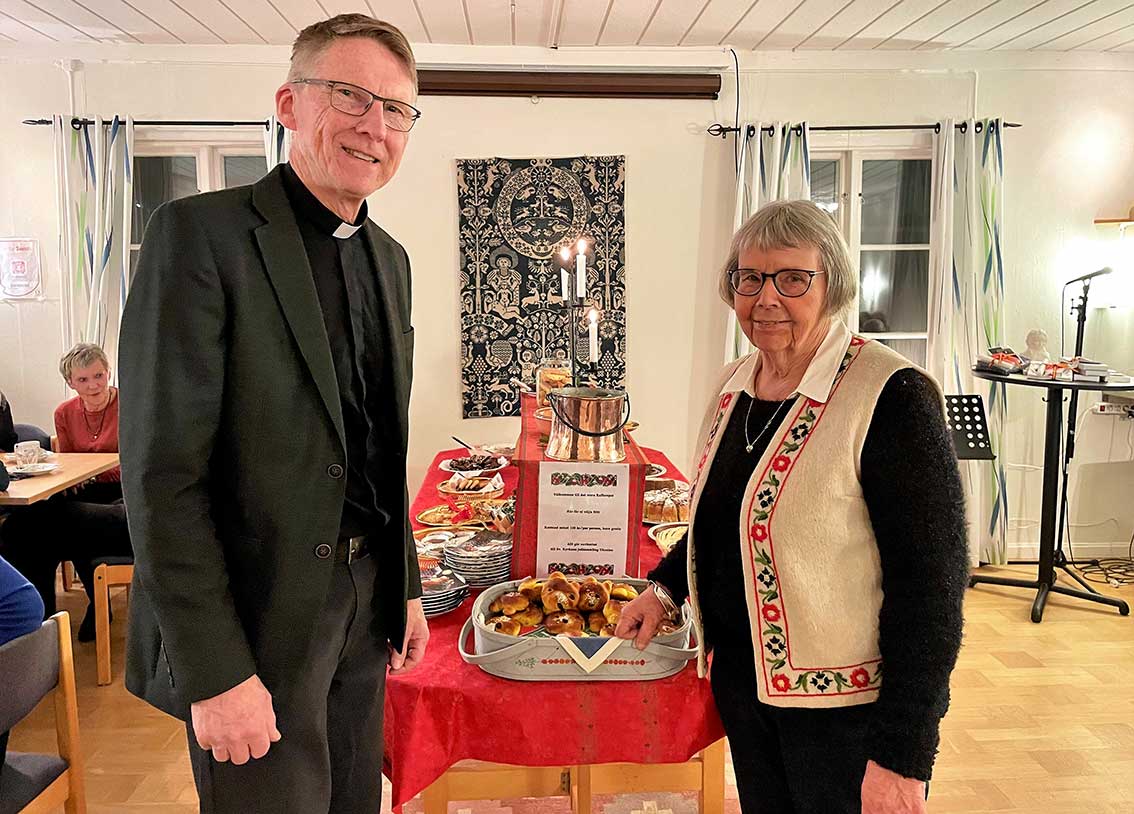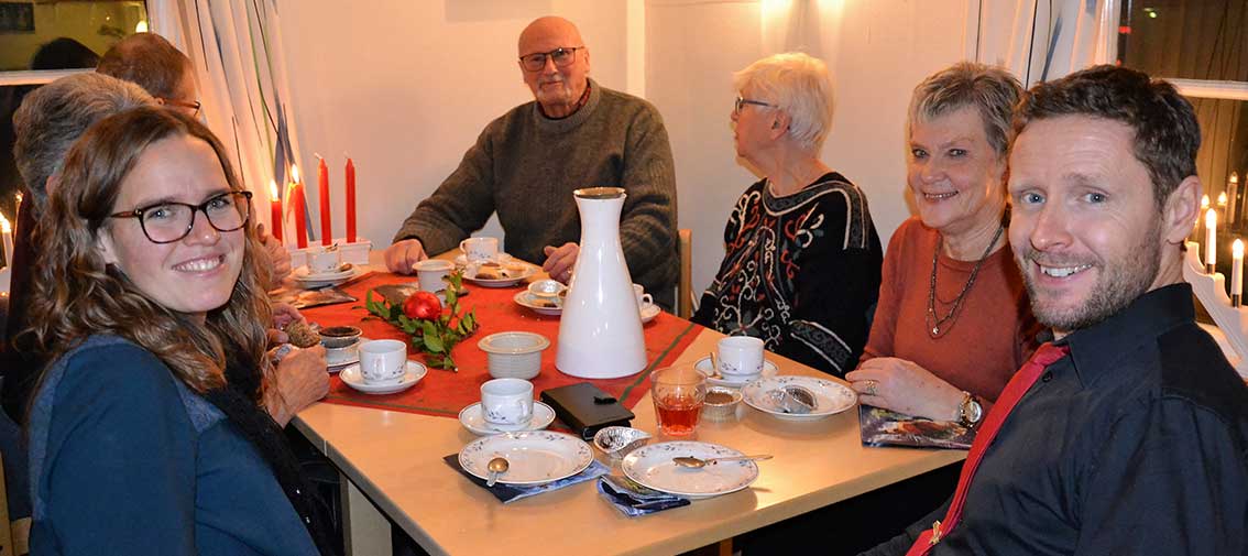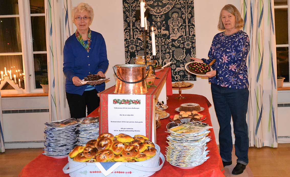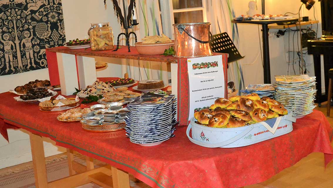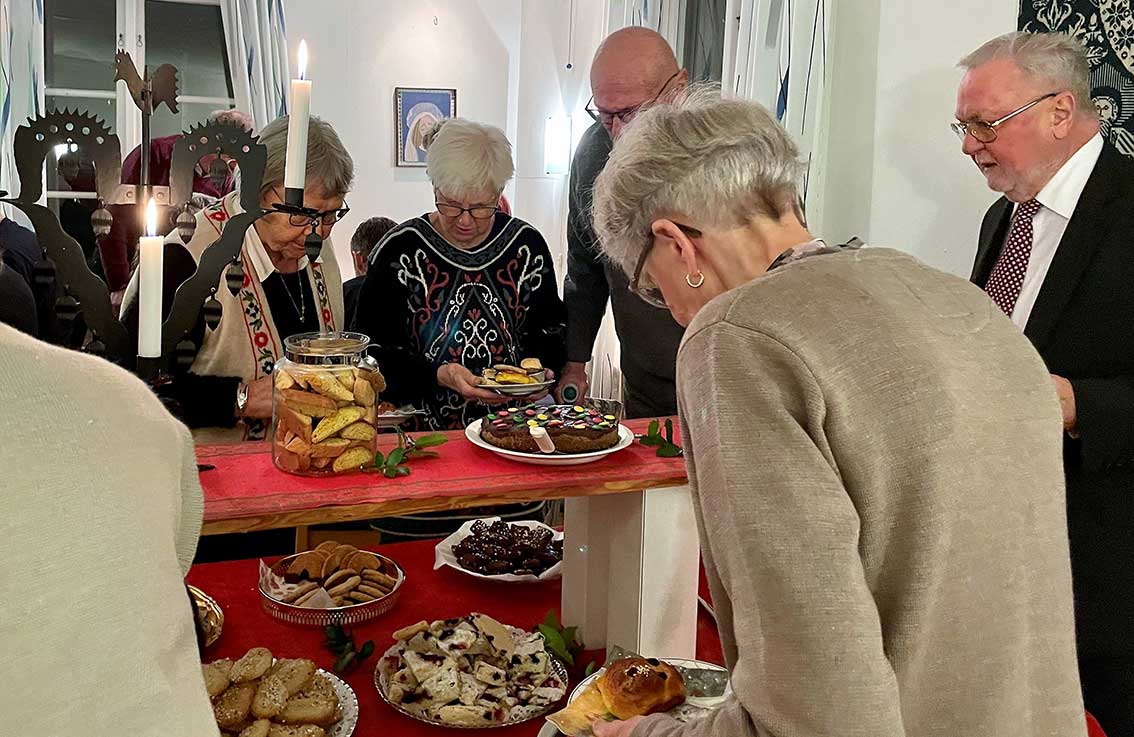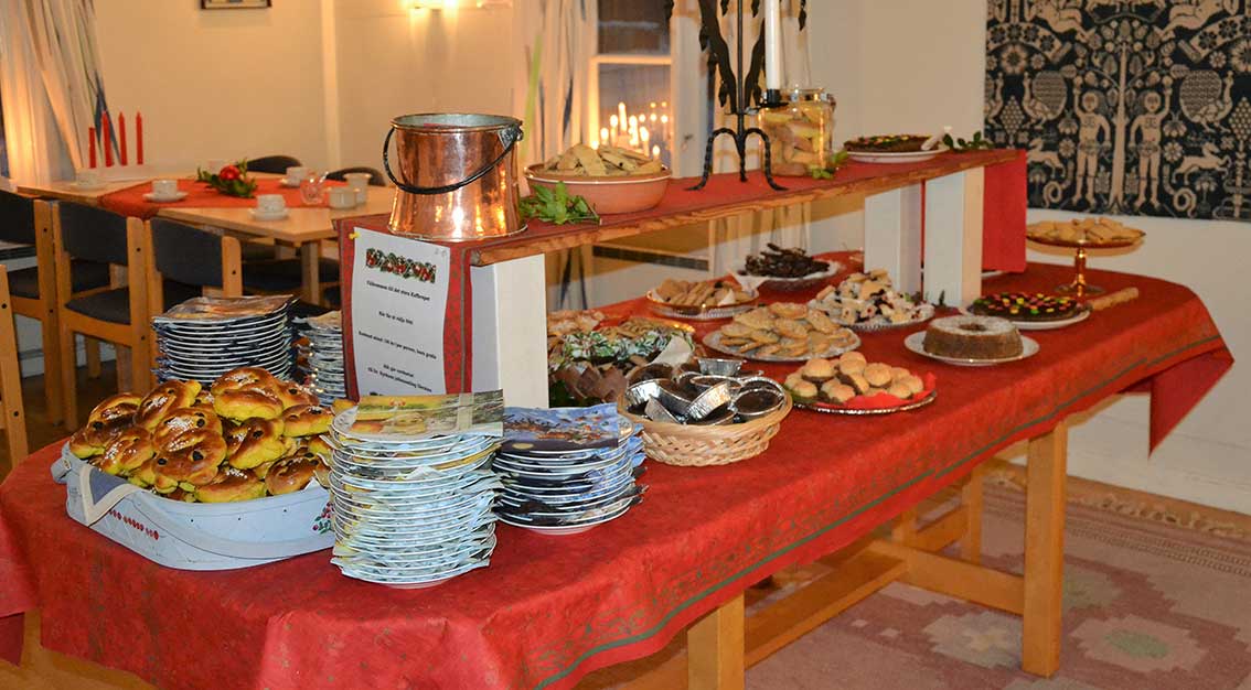 Efter gudstjänsten bjöd Ingemar oss in till församlingshemmet. Där väntades ”Det stora julkafferepet” och mycket riktigt stod kaffeborden dukade. Adventljusen lyste stämningsfullt i fönstren och i mitten av salen tronade det stora kakbordet, där många hembakade läckerheter frestade.
