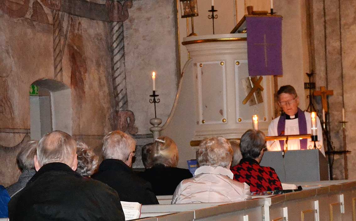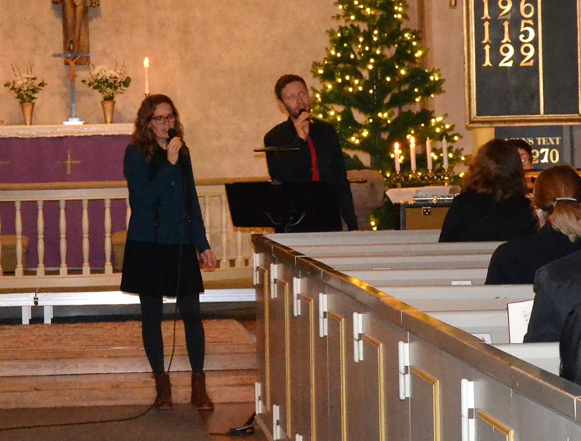 Kyrkoherde Ingemar Persson ledde musikgudstjänsten och reciterade bland annat dikten ”Det var en gång en åsna” av Ylva Eggehorn. Kören och Daniel sjöng flera av de älskade julsångerna som ”Sprid ditt ljus”. Det var duettsång av Daniel och Stina ”Jul, jul” och som avslutning den mäktiga psalmen ”O, helga natt”