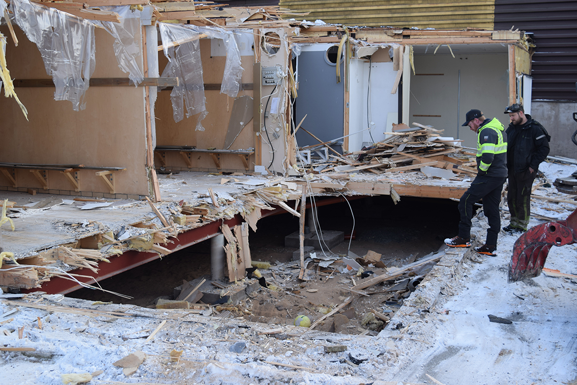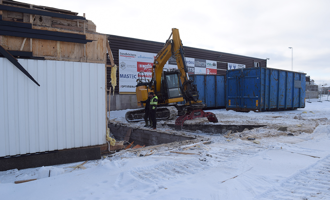 Fredrik Stålknapp, arbetsledare på ST bygg med säte i Vaggeryd, har hand om bygget från start till mål. – Vi började i dag med att riva de gamla omklädningsrummen som varit uttjänta, det jobbet tar nog en vecka ungefär, vi grovsorterar allt material samtidigt som vi river. Så fort vi är klara med rivningen ska marken igång, även om vädret talar emot oss då vi ska ner en bit ner i marken, berättar Fredrik och nämner att det var 70 centimeter tjäle på Fabriksgatan. – Vi håller ihop bygget från start till mål. Vi börjar mura i slutet av mars och då ska vi ha hunnit gjuta innan. Det ska vara klart här innan hockeysäsongen drar igång, september eller oktober någonting. Själva nybyggnaden är 34 gånger 16 meter fördelat på fyra omklädningsrum, aktivitetsyta, förråd och korridor. Allt är anpassat för att alla kan vara där, avrundar Fredrik innan vi går mot Gustav och hans grävmaskin som, i vårt tycke, redan kommit långt när vi anländer till Movalla vid lunchtid.