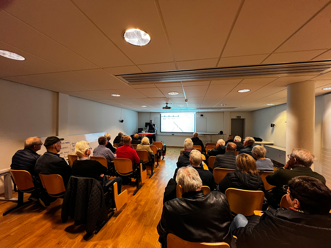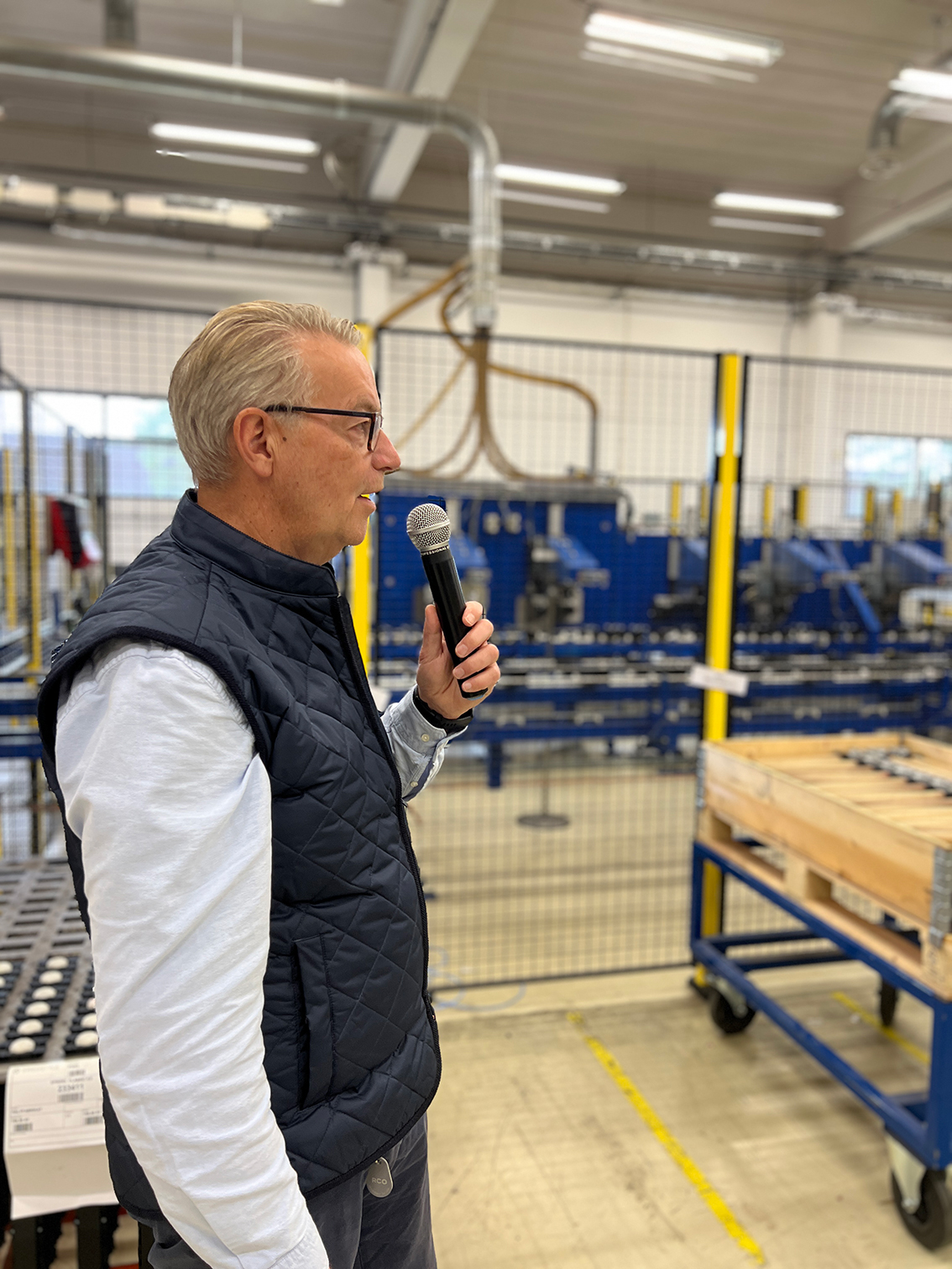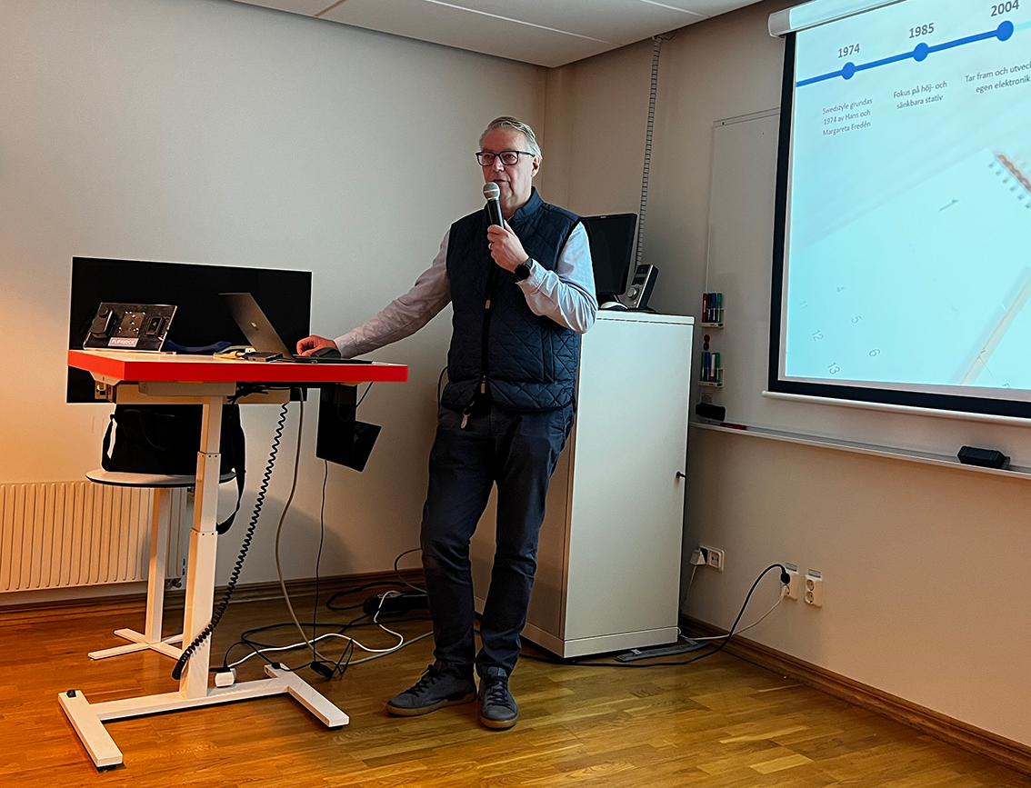 Peter Jahnsén, som ansvarar för flexlocktillverkningen hälsade välkomna och gav en mycket intressant tillbakablick på företagets utveckling från enmansföretag till dagens högautomatiserade produktionsenheter vid fabriker både i Vaggeryd för montering och i Ekenässjön där det finns kapacitet att tillverka en miljon stativ om året.