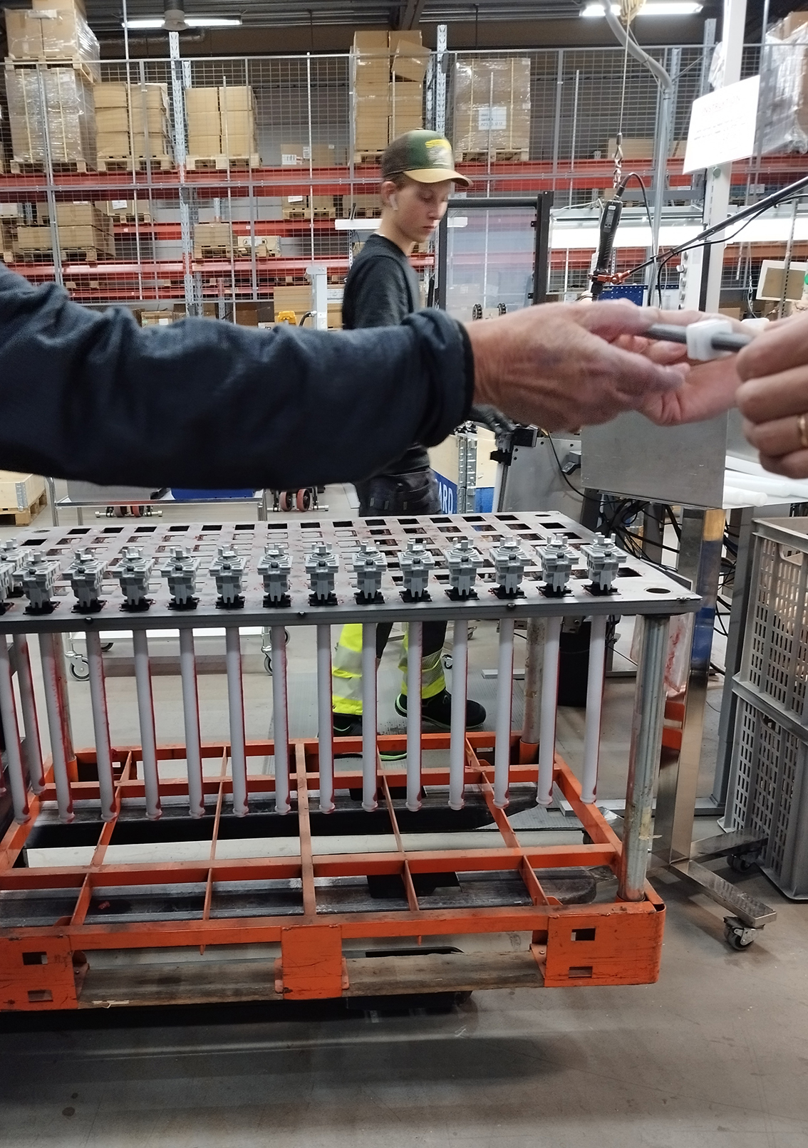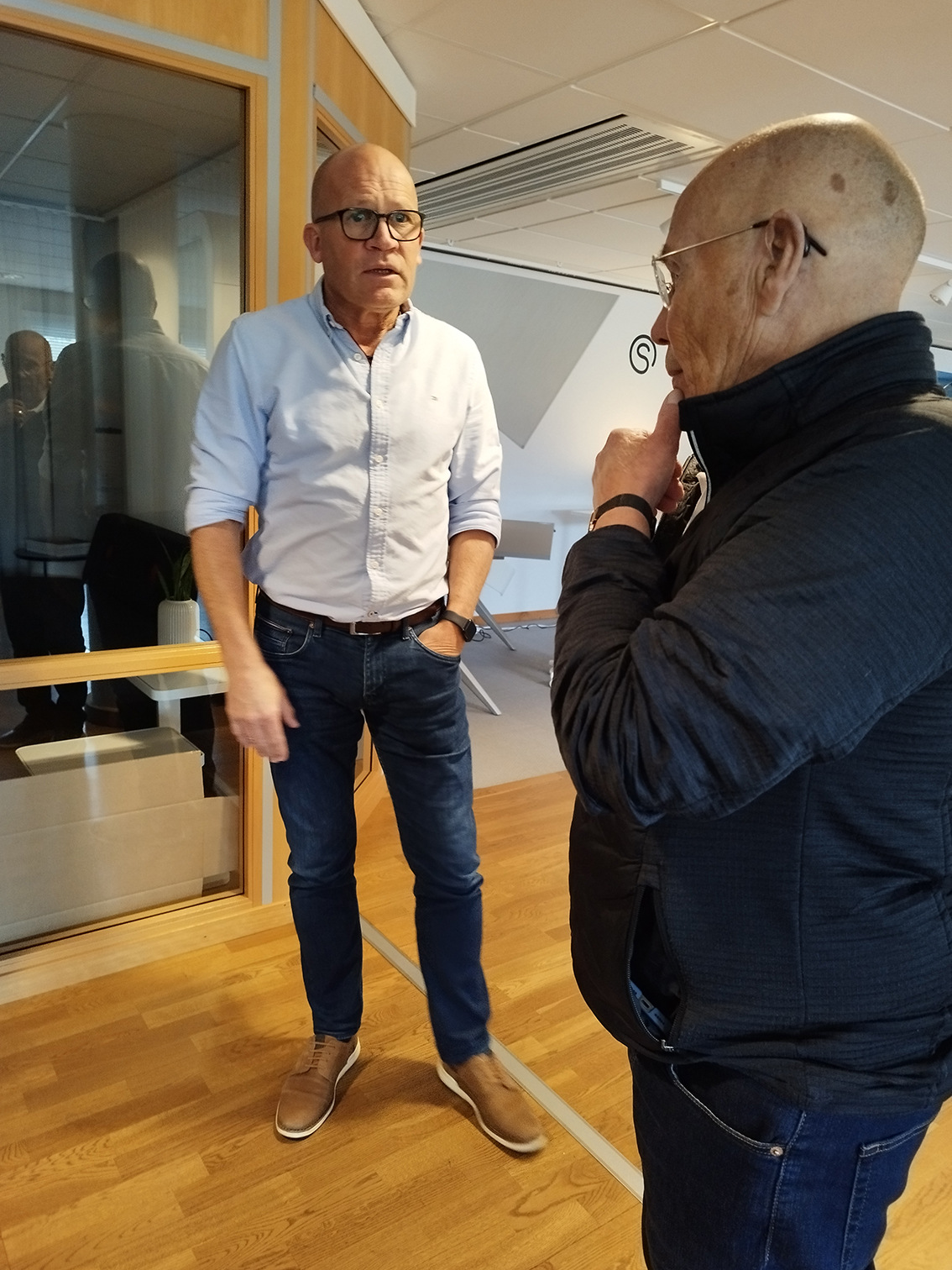 Peter Jahnsén och mångårige medarbetaren Eje Sahlstedt visade runt i kontors- och monteringsavdelningarna. Det är slående hur mycket som nu utförs av robotar i moderna industrier. Företaget har 200 anställda i Ekenässjön och 60 i Vaggeryd med huvudkontoret där, omsättning på över 70 miljoner euro och monteringsyta på 10.000 kvadratmeter i Vaggeryd och tillverkningsyta på 20 000 kvadratmeter i Ekenässjön. Det är klimatsmarta industrilösningar och företaget har egen test- och utvecklingsavdelning.