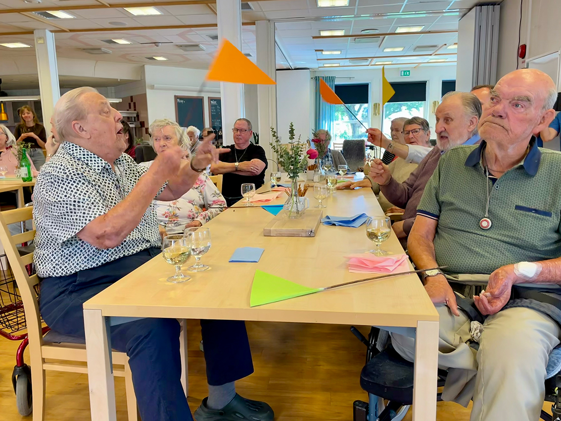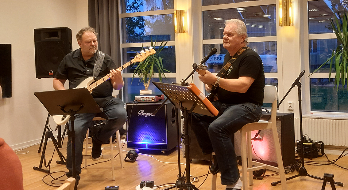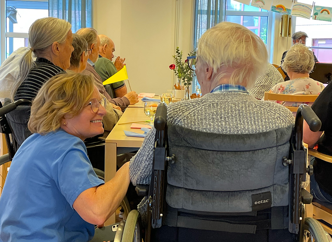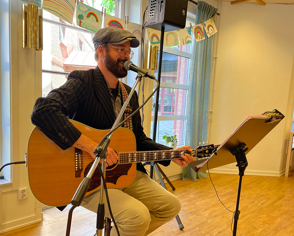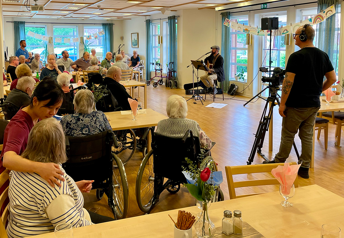 Restaurang Linnea var nästintill fullsatt i dag med boende, personal och anhöriga när Karl Martindahl tog fram gitarren och sjöng och spelade härliga låtar. Det var sånger av Evert Taube, Lasse Berghagen, Elvis och många andra. Vid borden satt förväntansfulla besökare och vid bordet längst fram hade man förberett sig med flaggor. Cider och salta pinnar var uppdukat när allsången drog i gång.