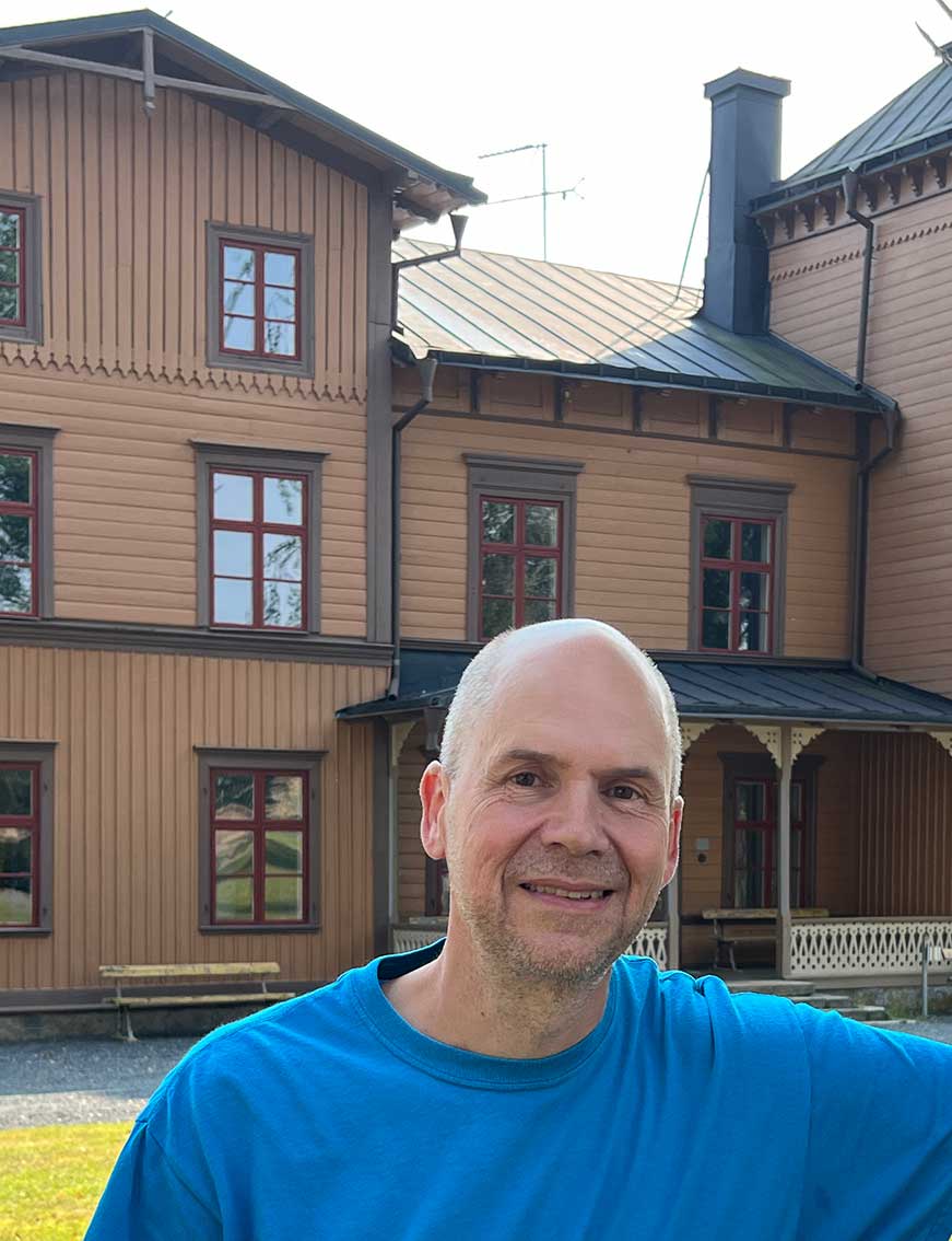 Sven Engkvist vid en av flera byggnader som är från slutet av 1800-talet.