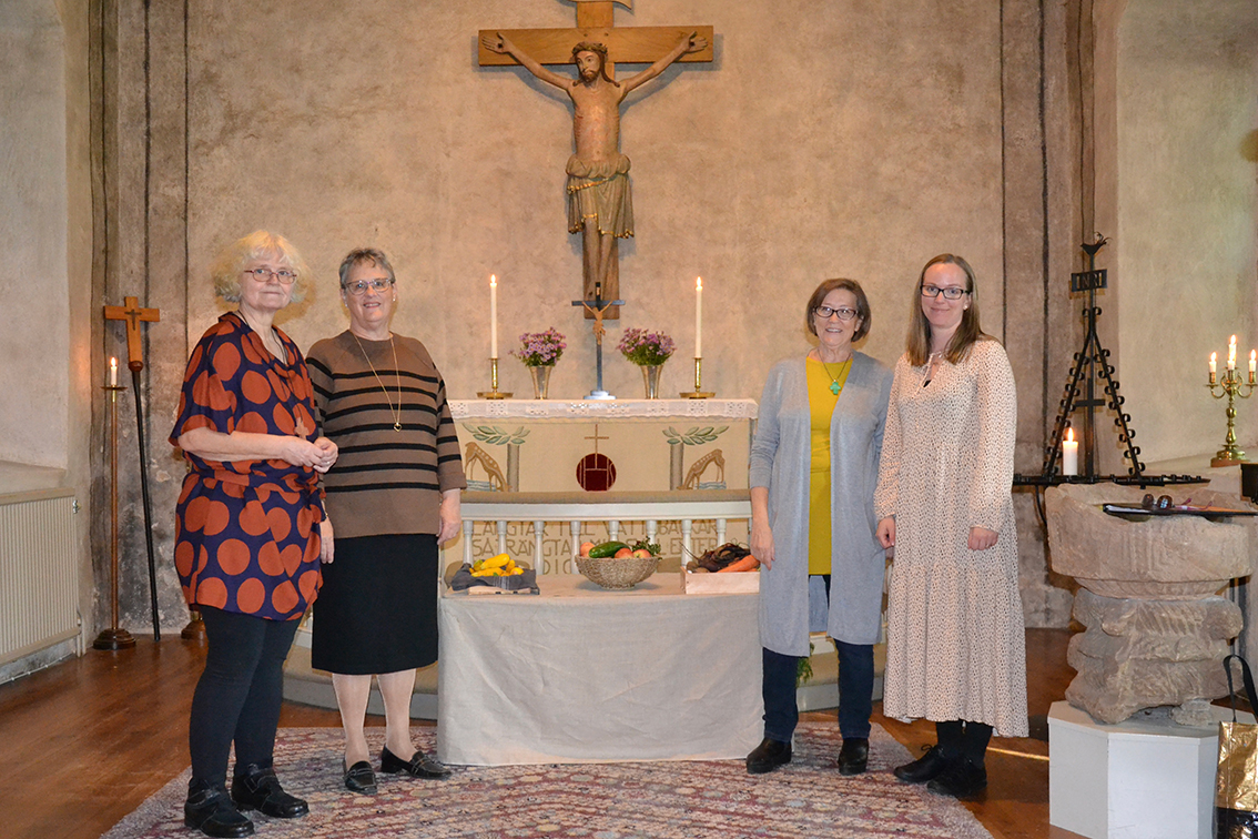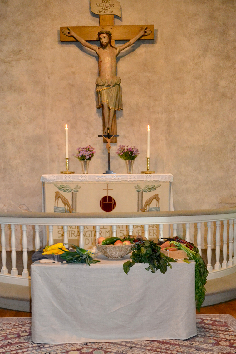 Präst var Cristina Virdung som predikade om dagens tema tacksamhet, att vi blir lyckliga när vi känner tacksamhet för stort som smått. Dagen till ära var kyrkan smyckad med höstens sista blommor och skördealster. I församlingshemmet som också var smyckat, bjöds det på kaffe med hembakade, olika sorters äppelkakor.