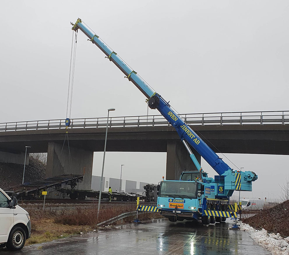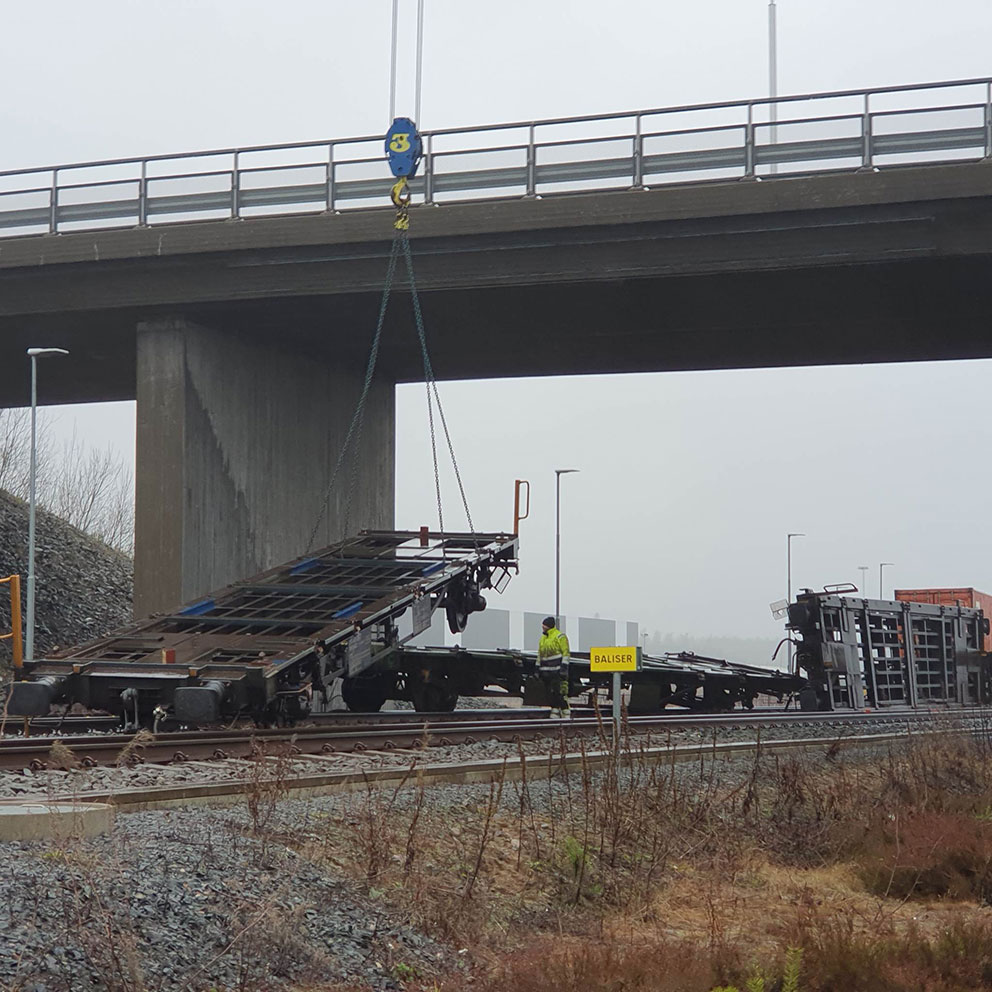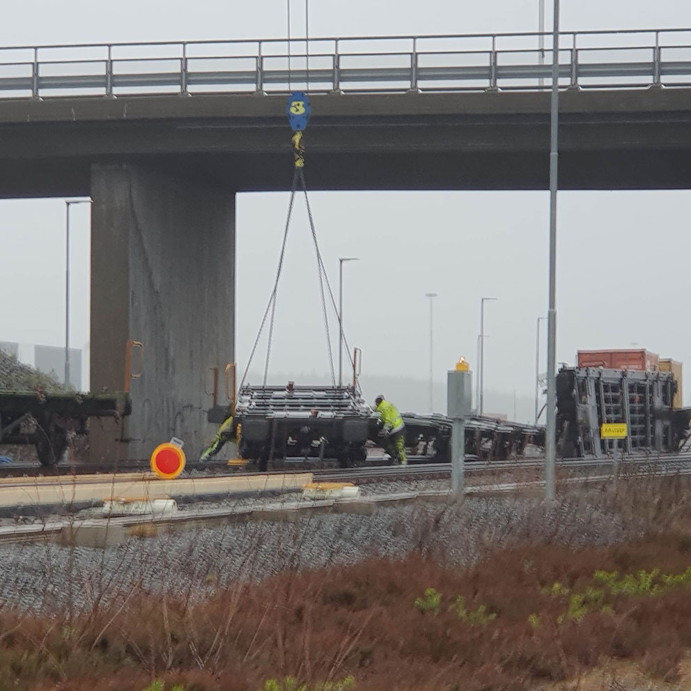 Under morgonen arbetar man med att lyfta upp godsvagnen från rälsen. Olyckan med urspårningen har skett precis under bron vid Båramo i Skillingaryd.