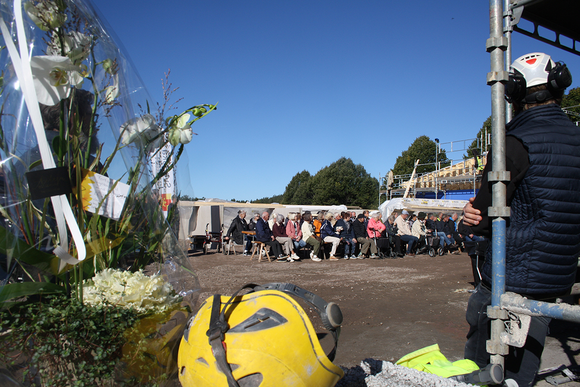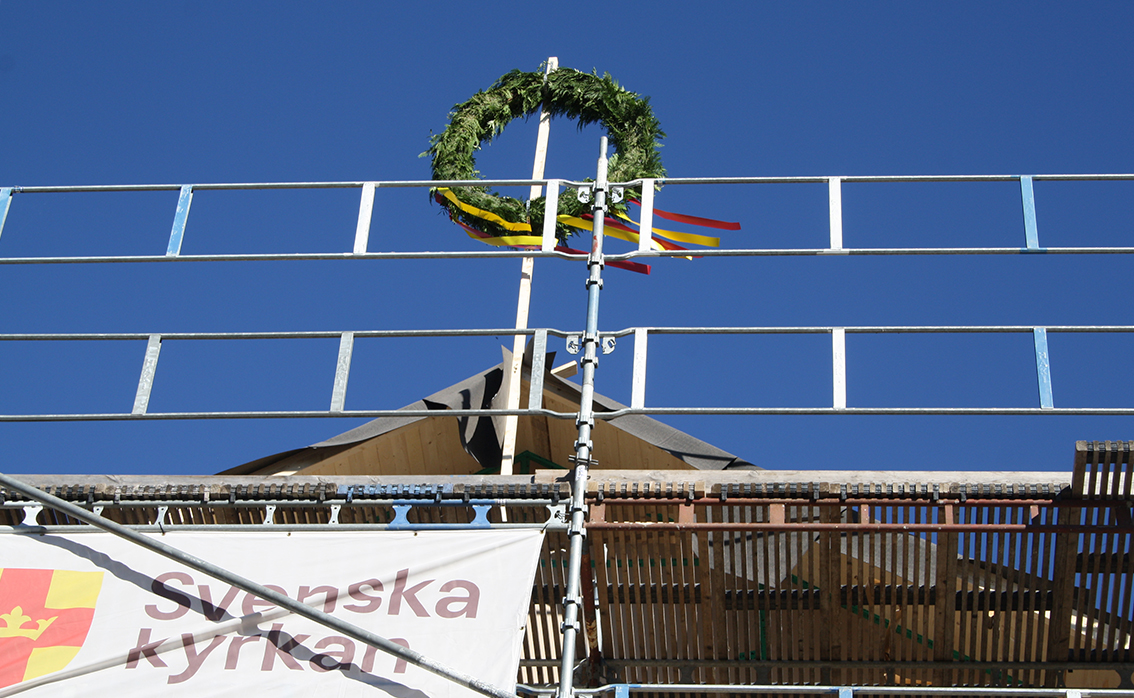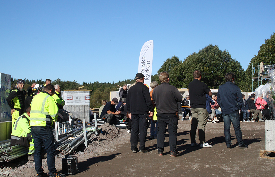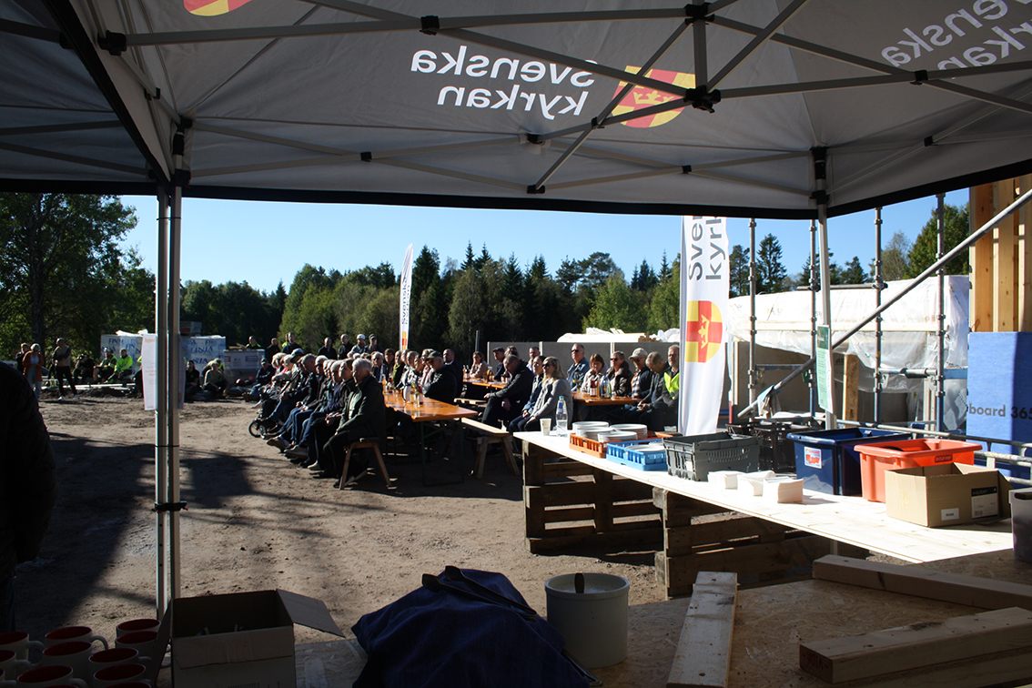 Så sa kyrkorådets ordförande Mats Bergman i sitt tal i går när över hundra personer kom och firade taket på det nya bygget vid Byarums kyrka. Kransen hängde på gaveln. Alla var samlade, så väl kyrkans personal, folk som jobbar med bygget, som människor från stiftet och medlemmar i församlingen.