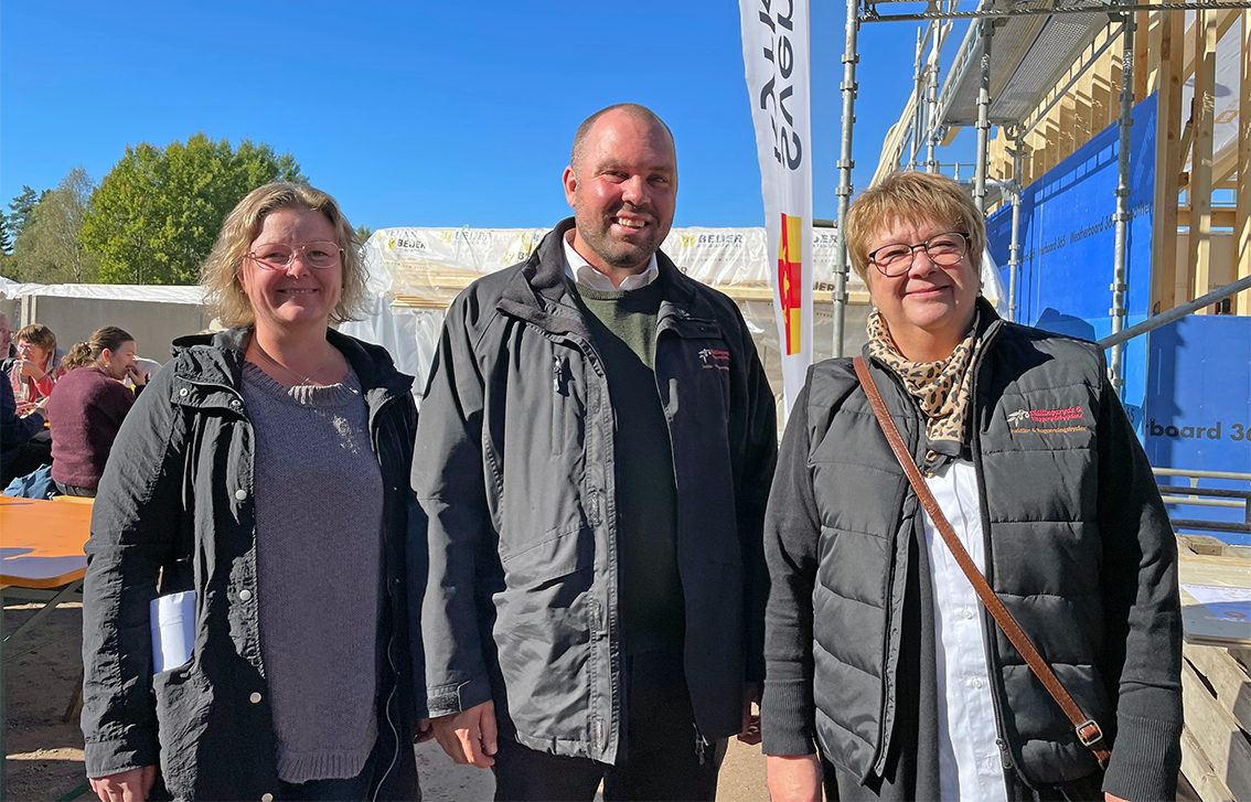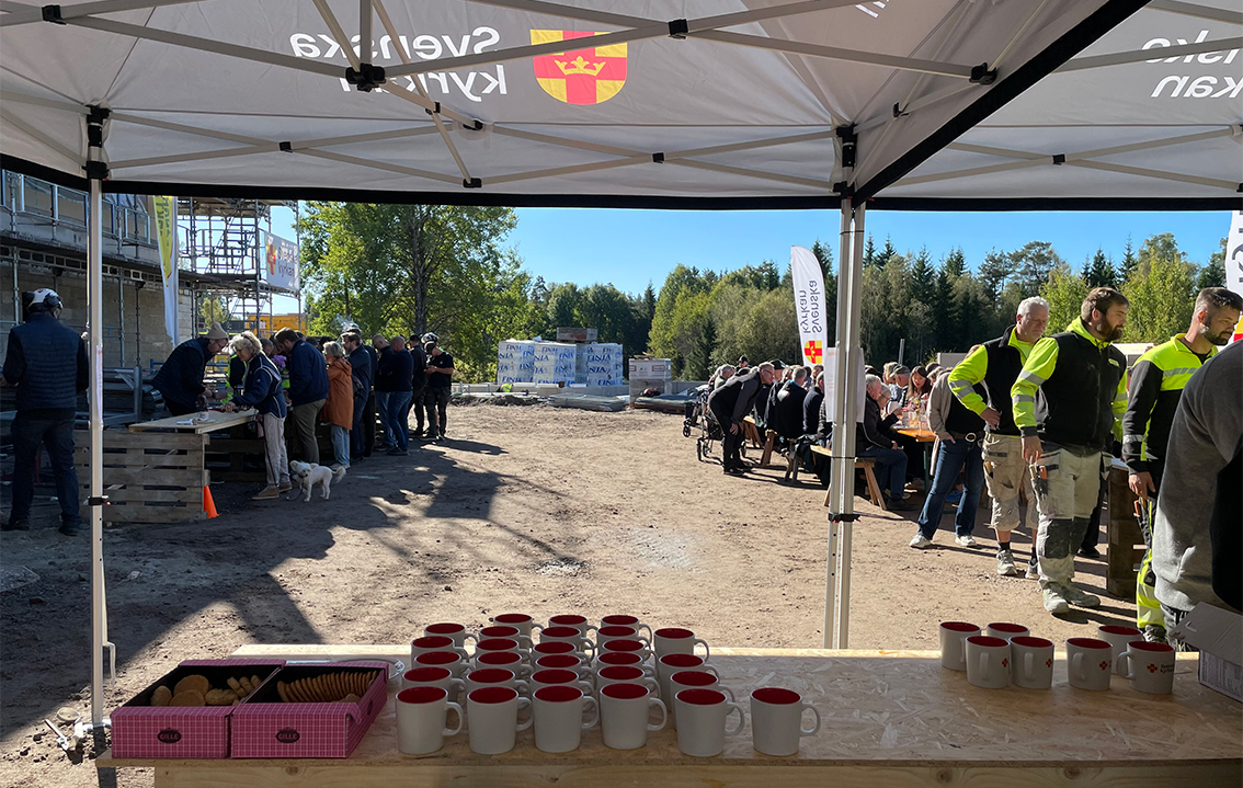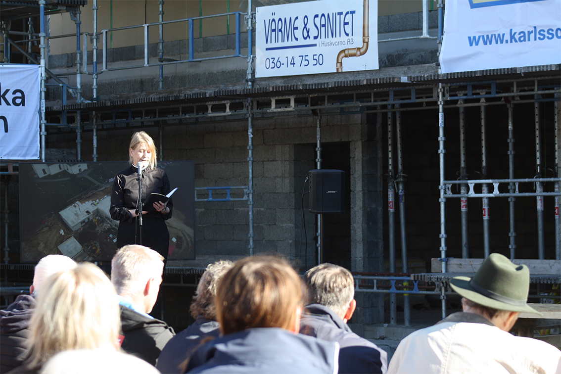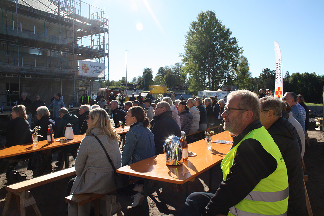 Så sa kyrkorådets ordförande Mats Bergman i sitt tal i går när över hundra personer kom och firade taket på det nya bygget vid Byarums kyrka. Kransen hängde på gaveln. Alla var samlade, så väl kyrkans personal, folk som jobbar med bygget, som människor från stiftet och medlemmar i församlingen.