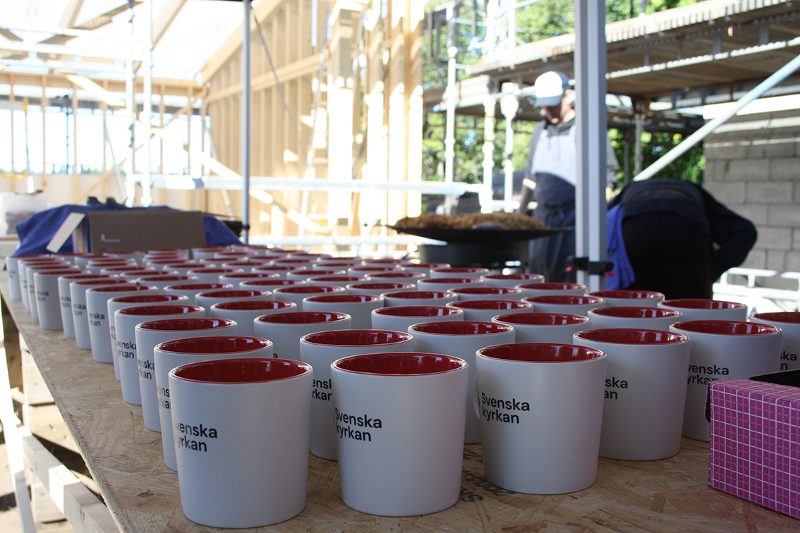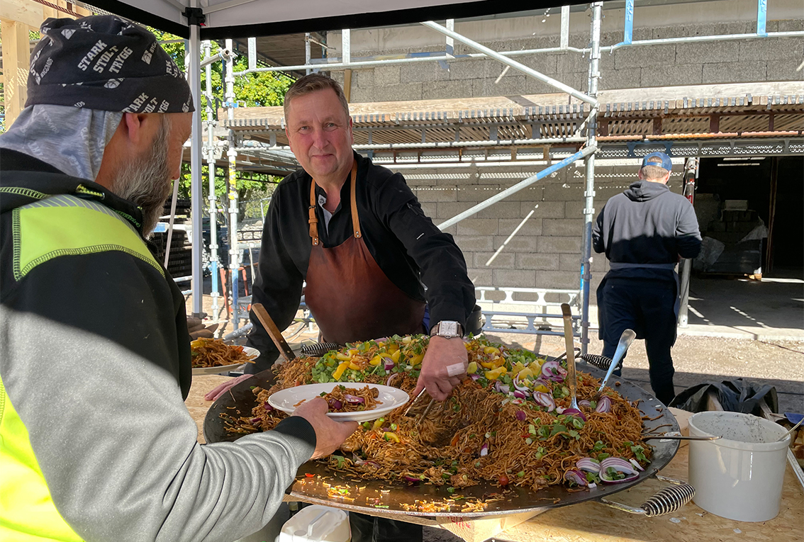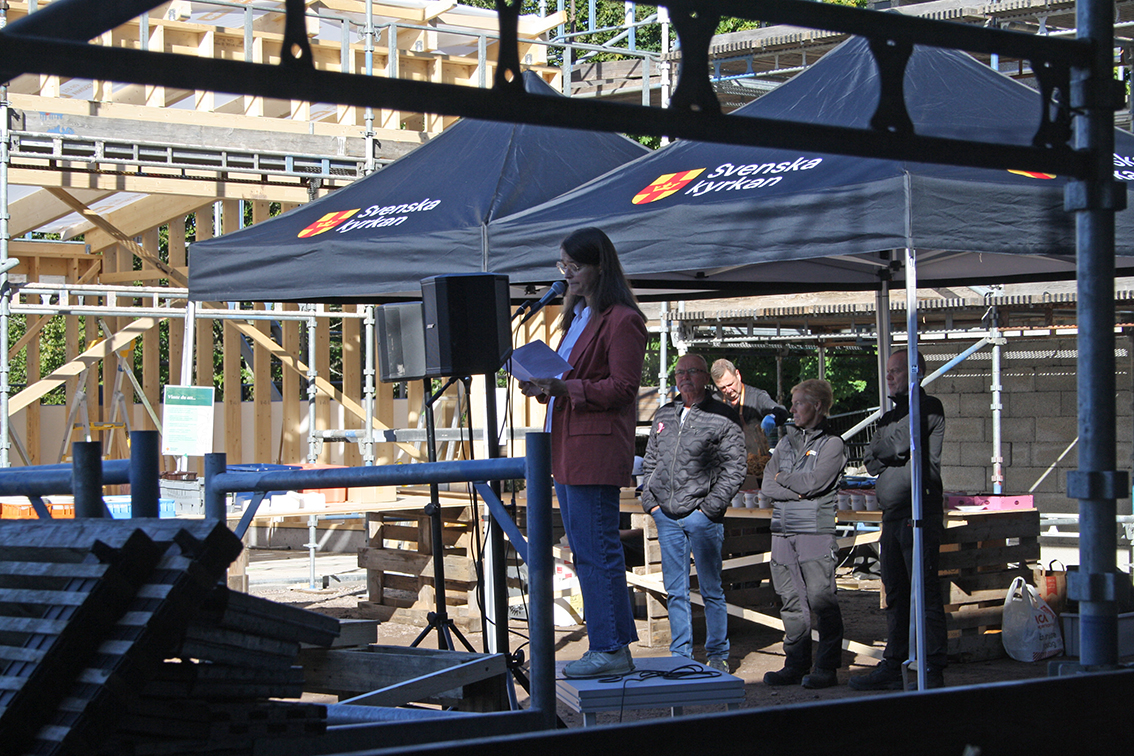 Stiftsgården Tallnäs stod för maten, en riktigt stor kyckling wok, som gott och väl räckte för alla. Taklagsfesten inleddes med tal och hyllningar. Målet är att bygget ska certifieras enligt miljöbyggnad silver. Miljöbyggnad är ett certifieringssystem inom hållbart byggande, som främjar energi-och resurshushållning. I bygget vid kyrkan använder man byggmaterial med låg klimat- och miljöpåverkan, tillvaratar regnvatten för bevattning och man återbrukar möbler och annan inredning, berättade Sara Nodmar, klimatstrateg på Växjö stift, i sitt tal.