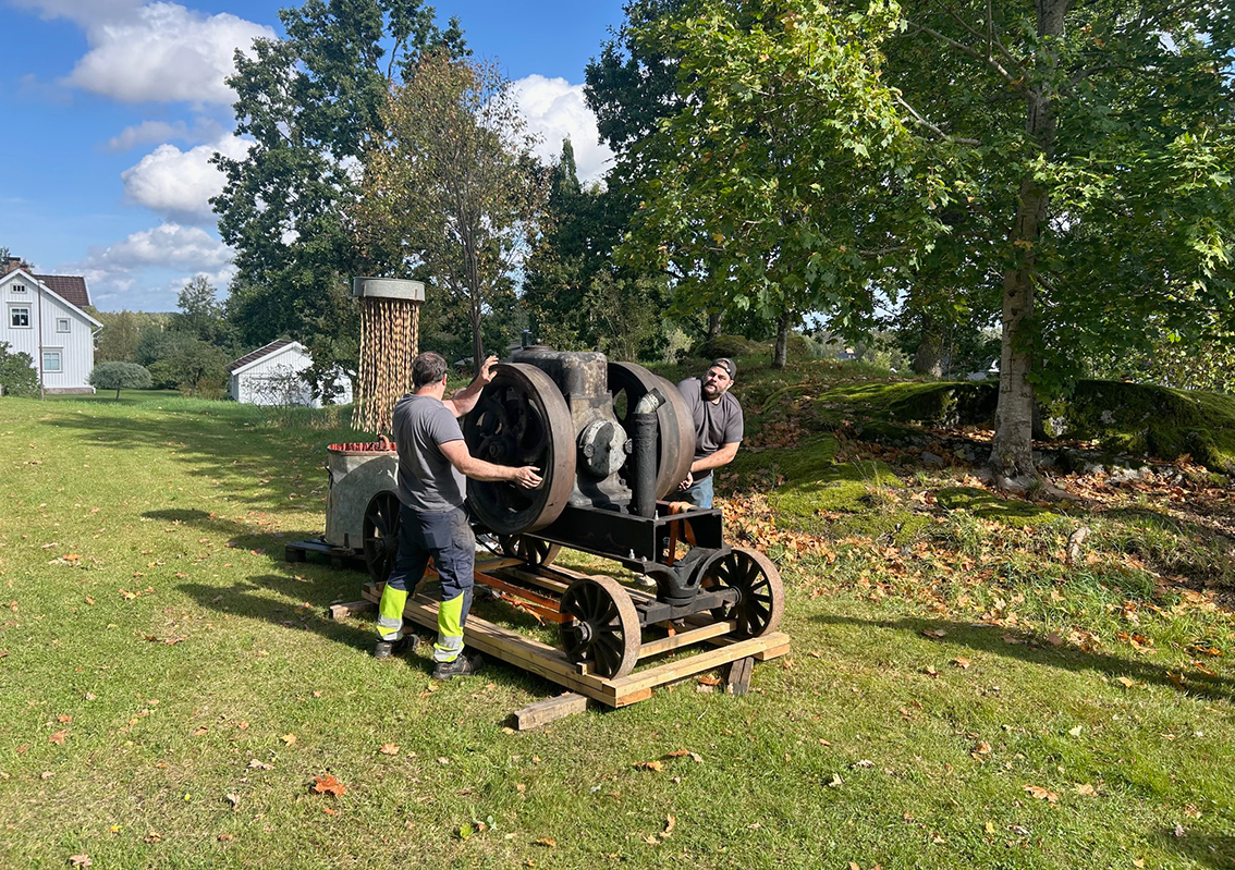 Tekniska killar drog igång tändkulemotorn – Björn och Markus är duktiga på motorer, den startades två gånger. Det gör man genom att man snurrar på hjulet fram och tillbaka och rätt var det är så hoppar motorn i gång. Den har ett säreget ljud, minst sagt.