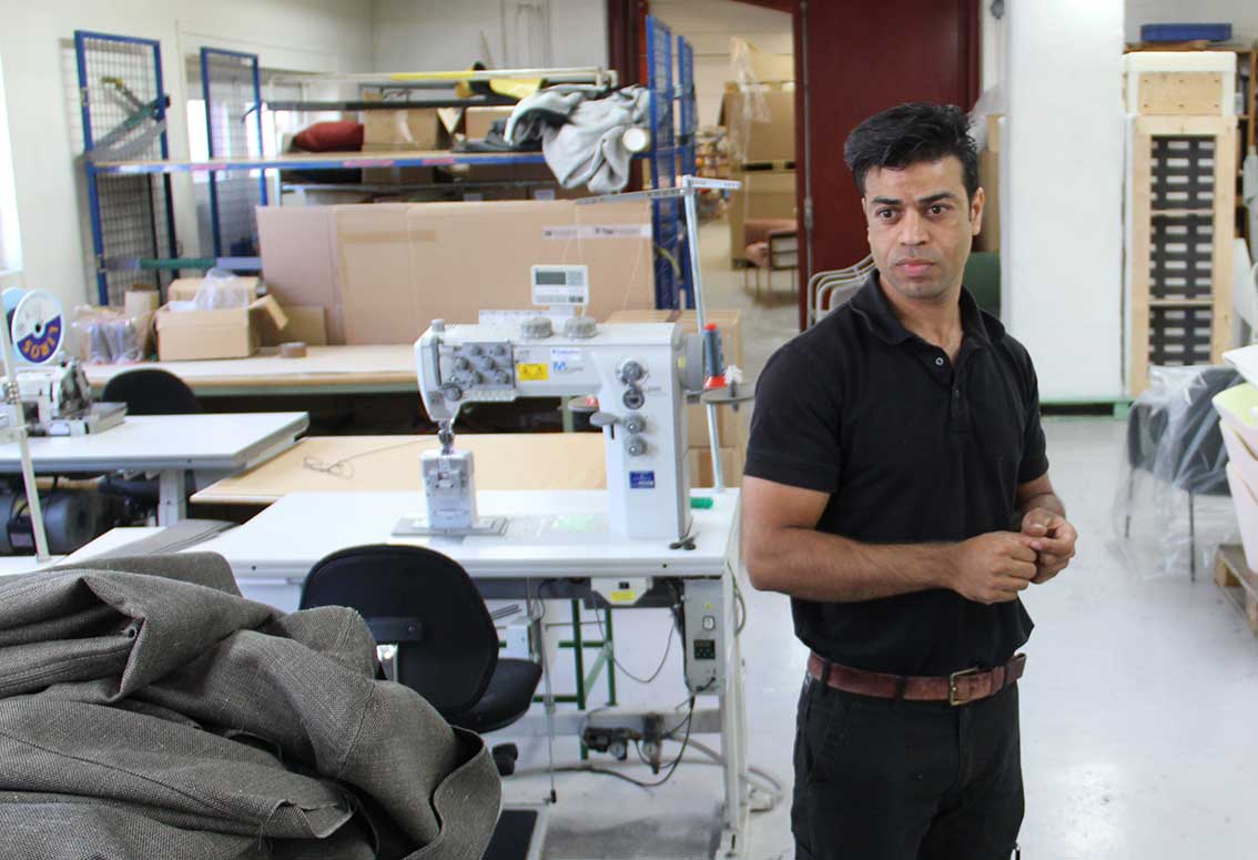 Han lärde sig snabbt svenska på SFI och behövde skingra sina tankar och upplevelser och kom 2018 på en tre månaders praktik till en konfektionsfabrik i Skillingaryd. Vår Konfektionsfabrik.