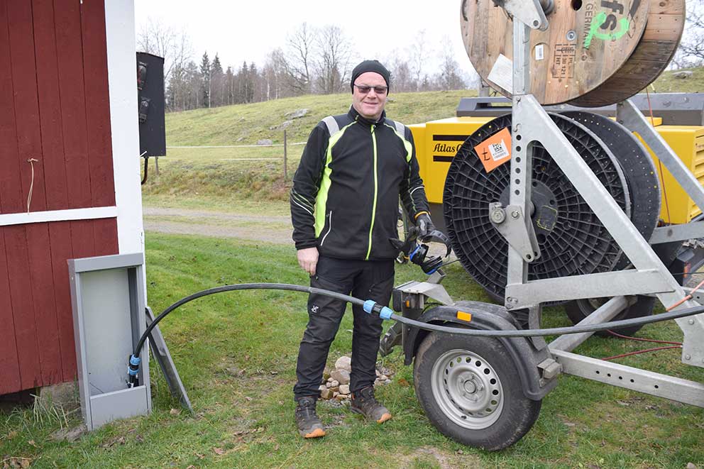 Från Ljungby kom under fredagen Tord Rosenvang och hans kollega för att blåsa in fiberkabeln mellan skåpen