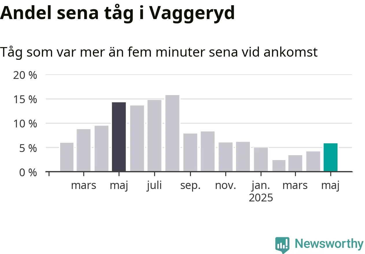 Förseningarna på järnvägen genom Vaggeryds kommun fortsätter att öka. I maj var sex procent av tågen mer än fem minuter sena – den högsta siffran sedan årsskiftet. Detta visar siffror som Newsworthy sammanställt.