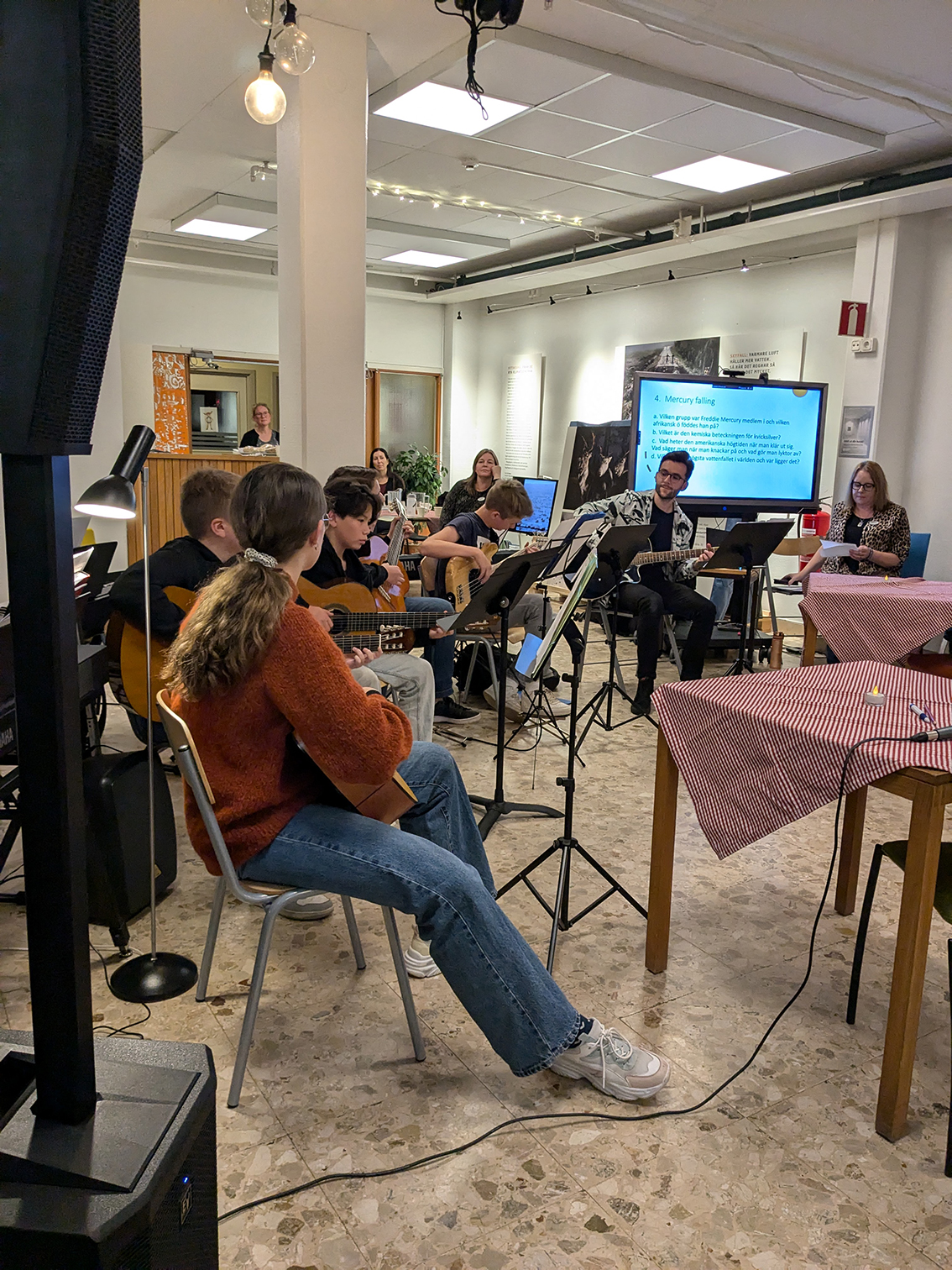 Elever i olika åldrar och personal från Kulturskolan bjöd på förstklassig sång och musik på gitarr, piano, bas, tvärflöjt, fiol och trummor och personal från biblioteken stod för frågorna.