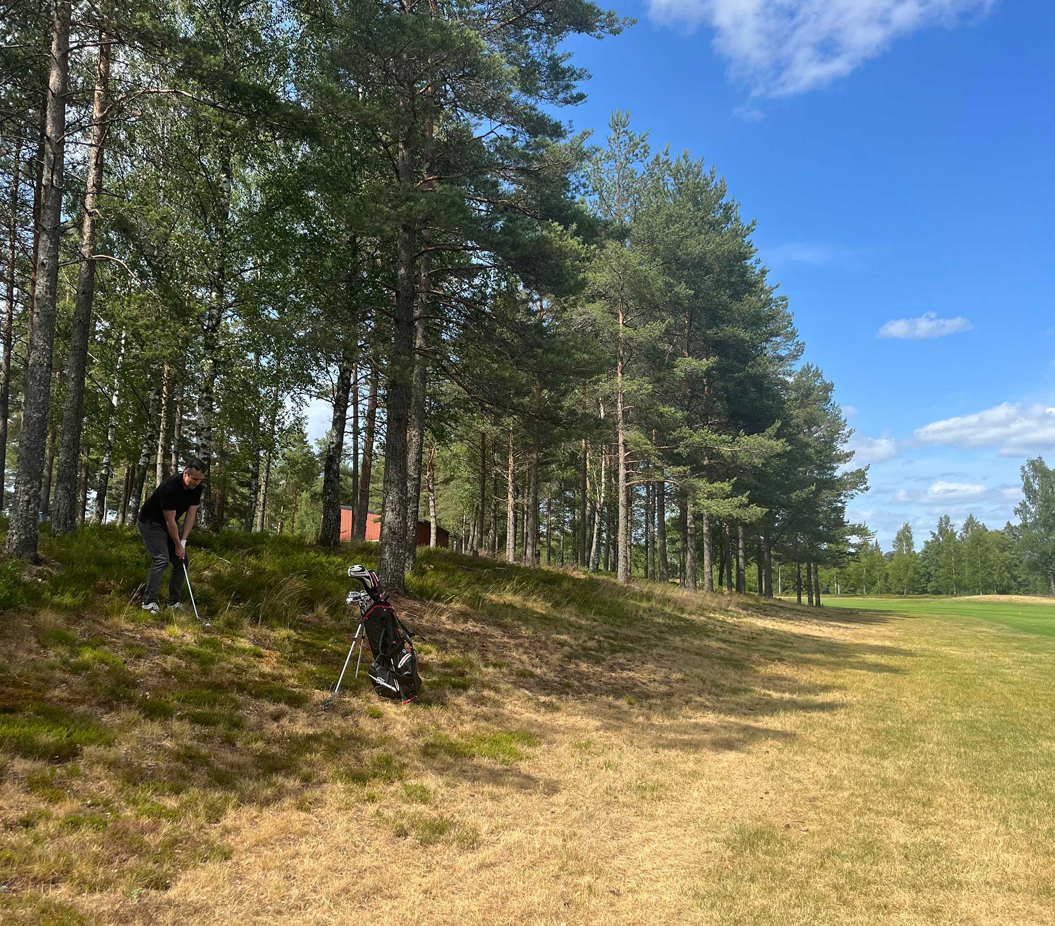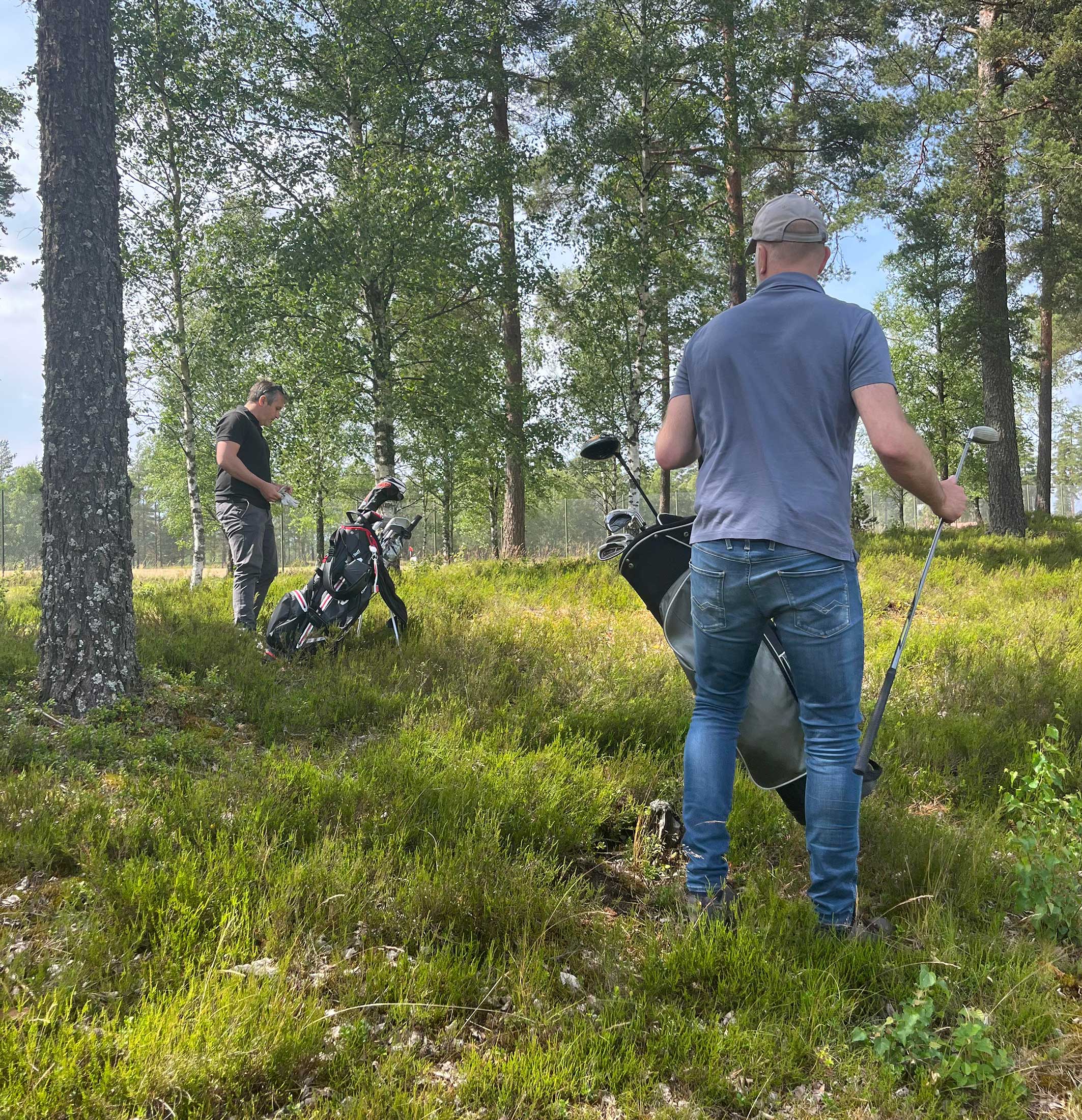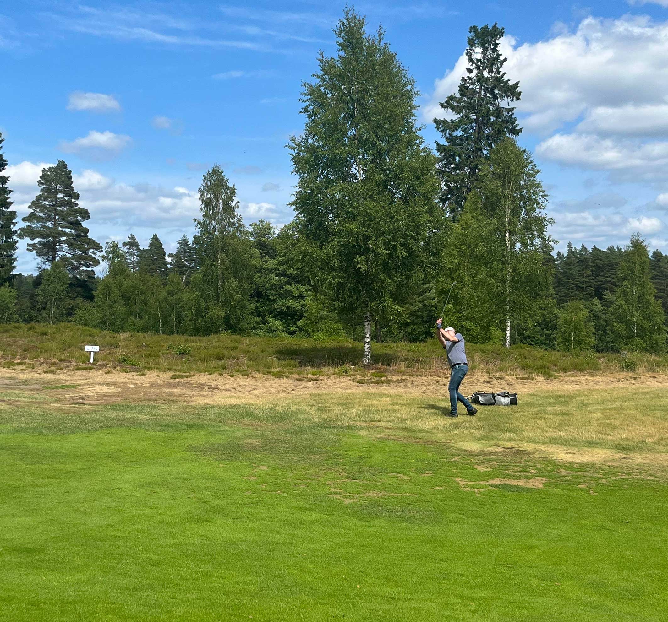 – Jag vet, men det handlar om att ta till vara på hela naturupplevelsen, svarar Marcus som lyckas slå ut bollen ur ljungen och in i nästa skogsområde.