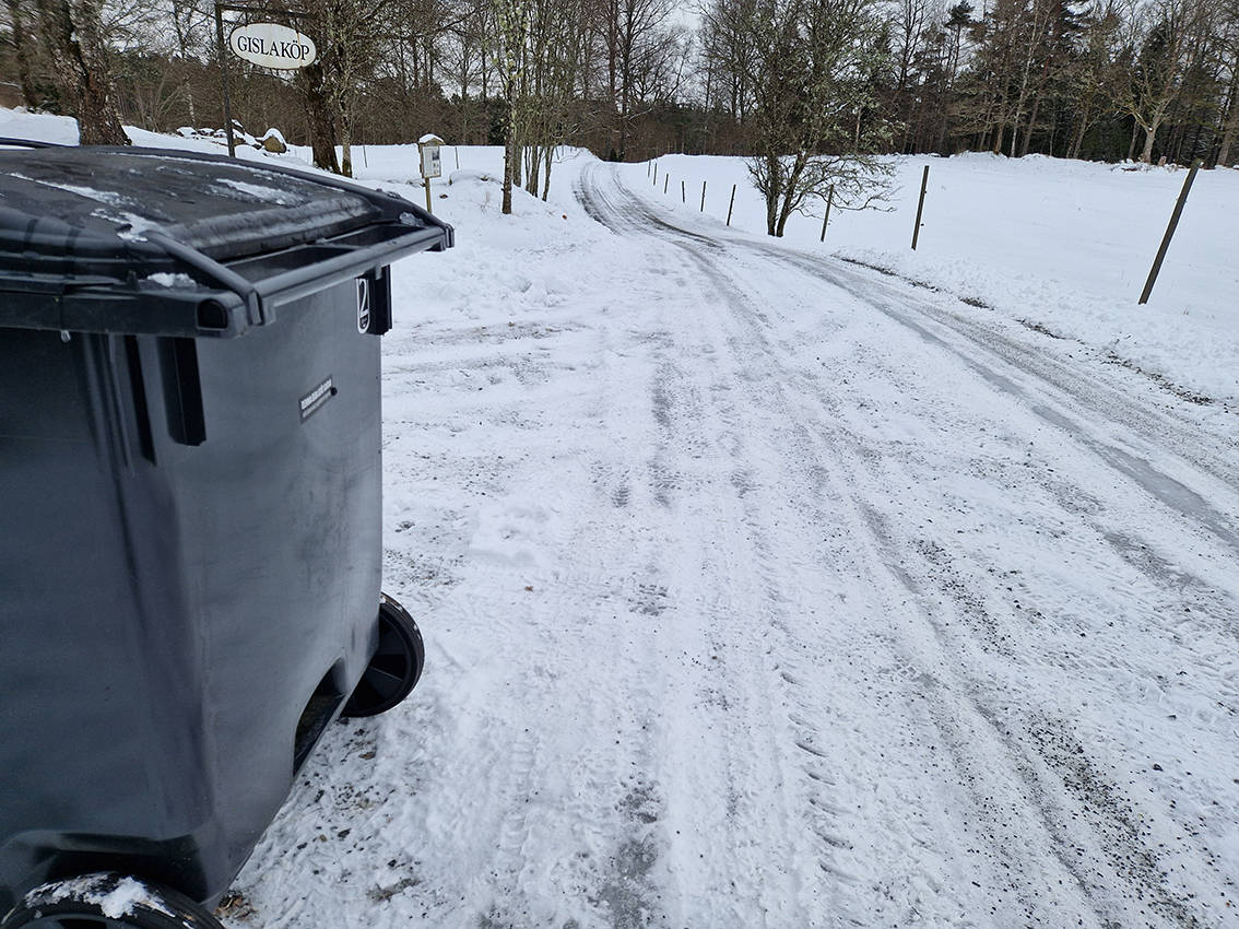 Då undrar jag hur de resonerat de tidigare vintrarna, som varit av större dignitet, där sophämtningen har fungerat?  Vår enskilda väg är betydligt bättre skick, och säkrare, än samhällsgatorna och framför allt än Nyholmsvägen. Har sopbilen kommit ända från Skillingaryd, på Nyholmsvägen, och ner till korsningen där man kör in på vår lilla enskilda väg, då kan man åka hela vägen in och tömma mina, och grannarnas, tunnor. Trafikverket har inte Nyholmsvägen som sin prioritetskörning när det gäller halkbekämpning.