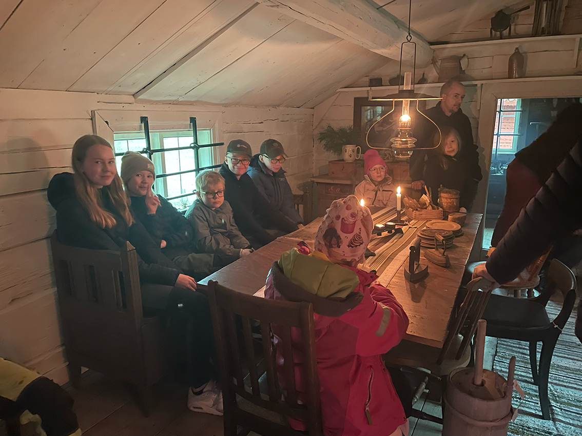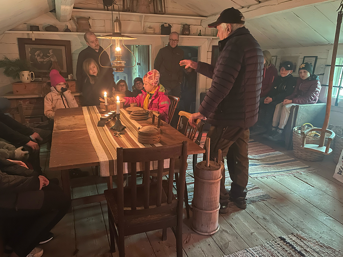 Inne i stugan hade föreningen eldat så det var varmt och skönt men ganska rökigt. Här berättade Bertil Gunnarsson om stugan och hur familjerna bodde förr i tiden. Han berättade också om olika föremål som fanns i stugan som smörkärna, trefotsgrytor, tallrikar i trä och bestick i horn. Här fick man också tillfälle att ställa frågor.