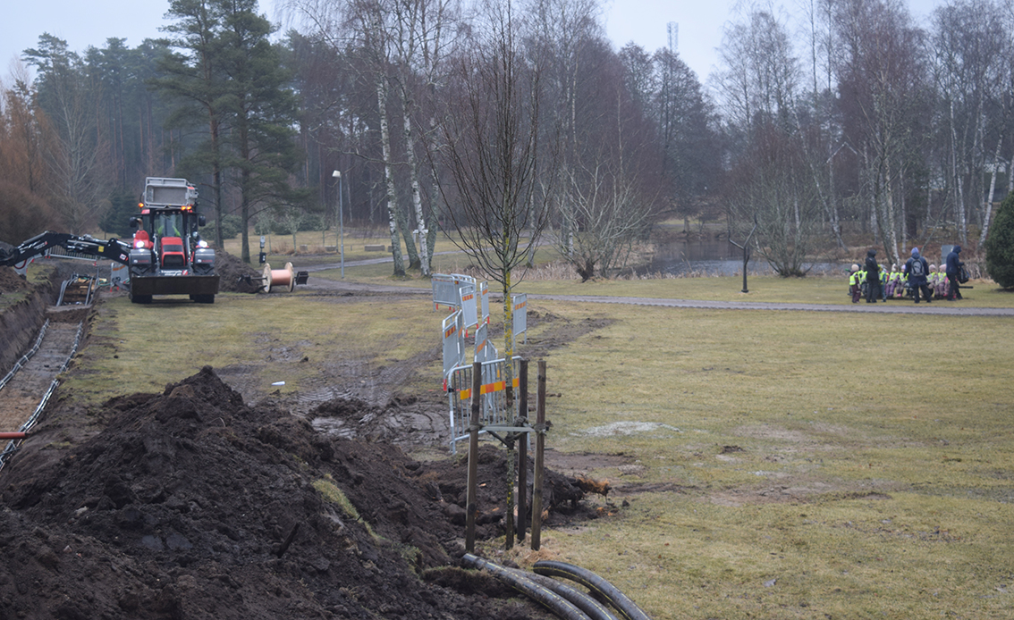 Själva grävarbetet i kanten av parken är i det närmaste klart och på denna sidan har arbetsområdet varit stort. Marcus Karlsson igen: – Vi har lite mindre utrymme att vara på längre fram mot skolan, där är det lite trångt. Ambitionen är att vi inte ska ta ned några träd. Allmänheten har varit orolig att vi gör åverkan i naturstråket men det är vår högsta ambition från oss att det inte ska behöva ske, avrundar Marcus och Robert.