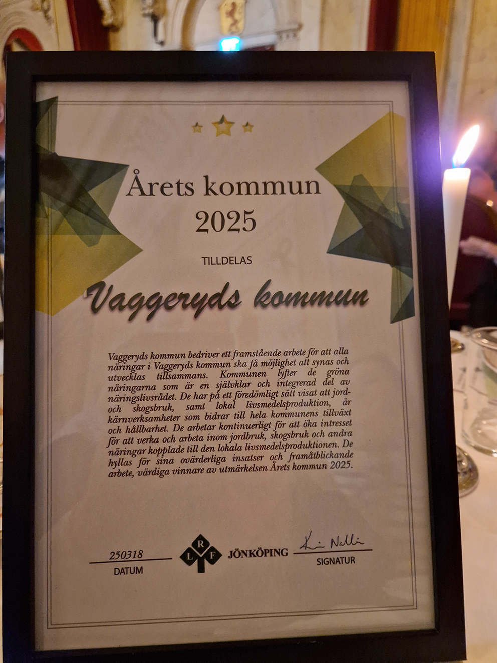 Motiveringen var: "Vaggeryds kommun bedriver ett framstående arbete för att alla näringar i Vaggeryds kommun ska få möjlighet att synas och utvecklas tillsammans. Kommunen lyfter de gröna näringarna som är en självklar och integrerad del av näringslivsrådet. De har på ett föredömligt sätt visat jordbruk och skogsmark, samt lokal livsmedelsproduktion, är kärnverksamheter som bidrar till hela kommunens tillväxt och hållbarhet. De arbetar kontinuerligt för att öka intresset för att verka och arbeta inom jordbruk, skogsbruk och andra näringar kopplade till den lokala livsmedelsproduktionen. De hyllas för sina ovärderliga insatser och framåtblickande arbete, värdiga vinnare av utmärkelsen "Årets kommun 2025"