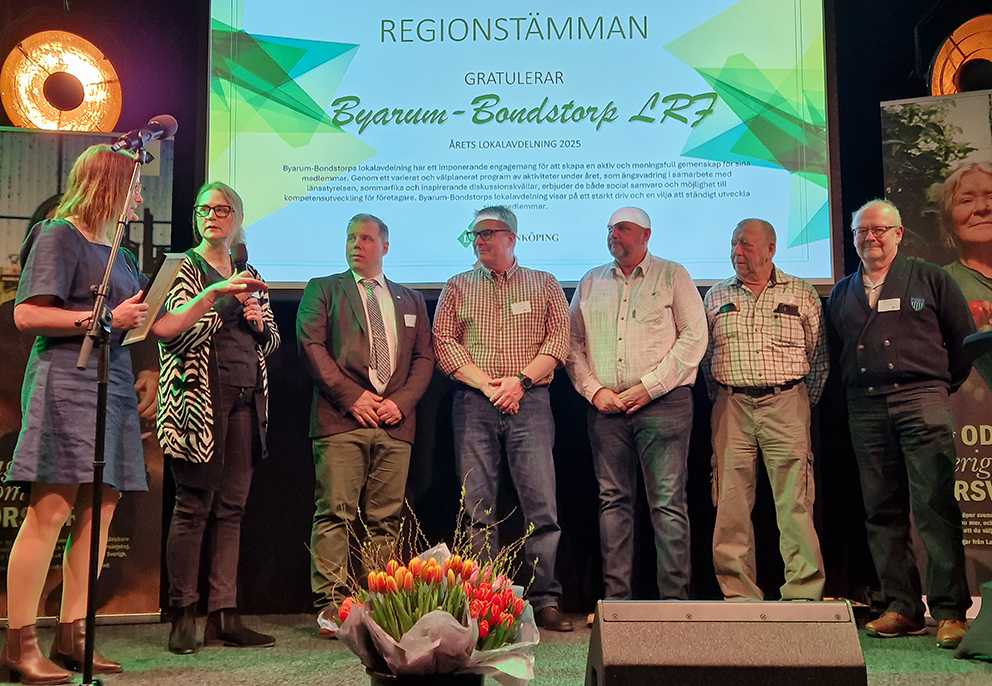 Det var inte bara kommunen som fick gå upp på scen på Stora hotellet under tisdagskvällen. Årets lokalavdelning 2025 utsågs och vinnaren blev Byarum-Bondstorps LRF. Motivering nedan: