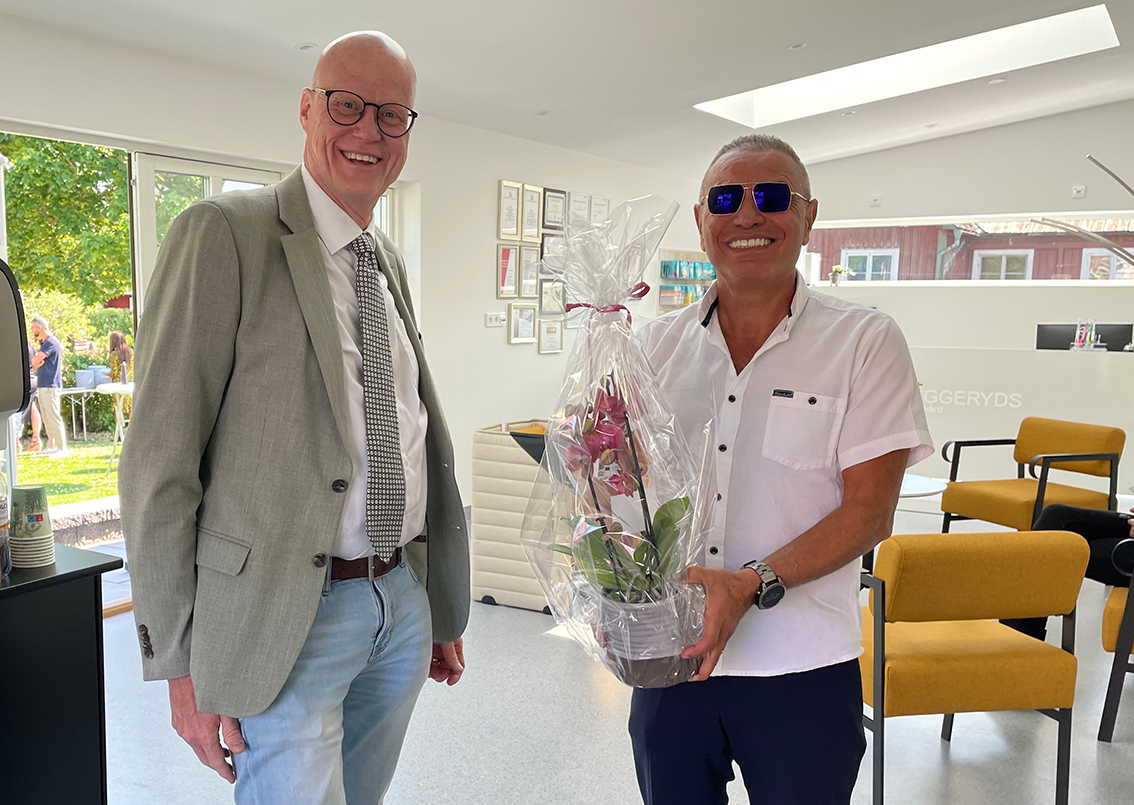– Vilka fina lokaler, så otroligt fräscht och modernt, säger näringslivschef Johan Thorsell som välkomnar den nya kliniken med en blomma.