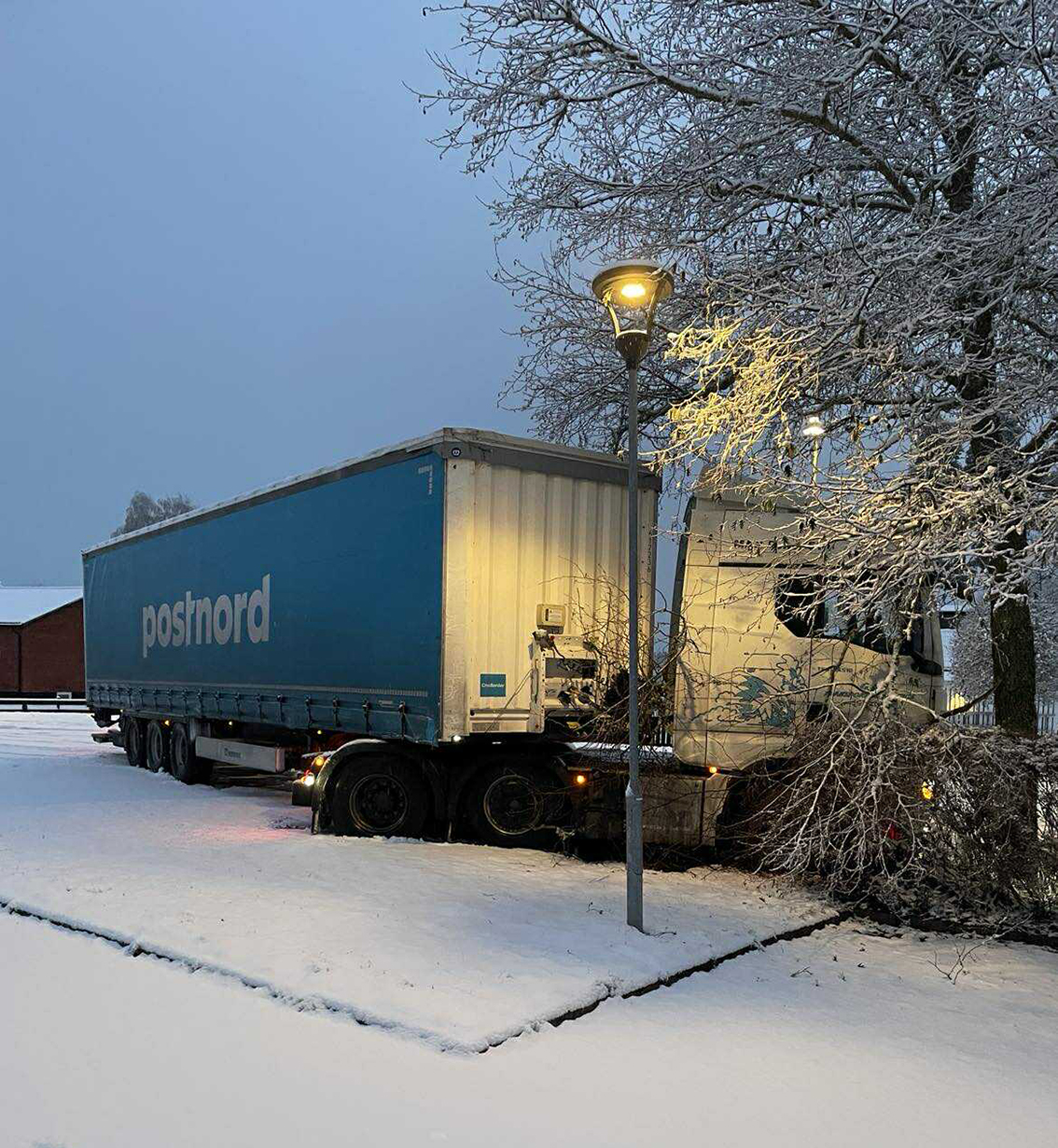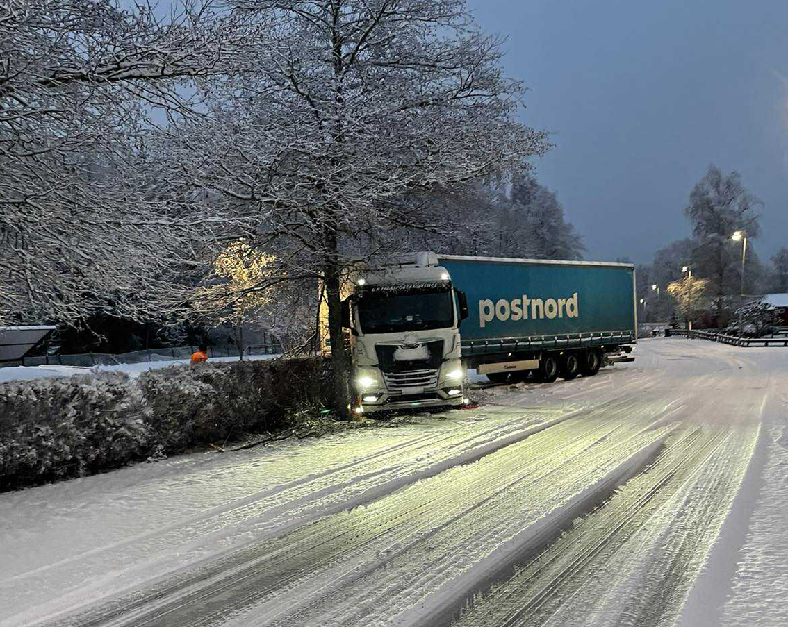 En lastbil körde av vägen vid stationen i Hok i eftermiddags efter att ha väjt för en bil.