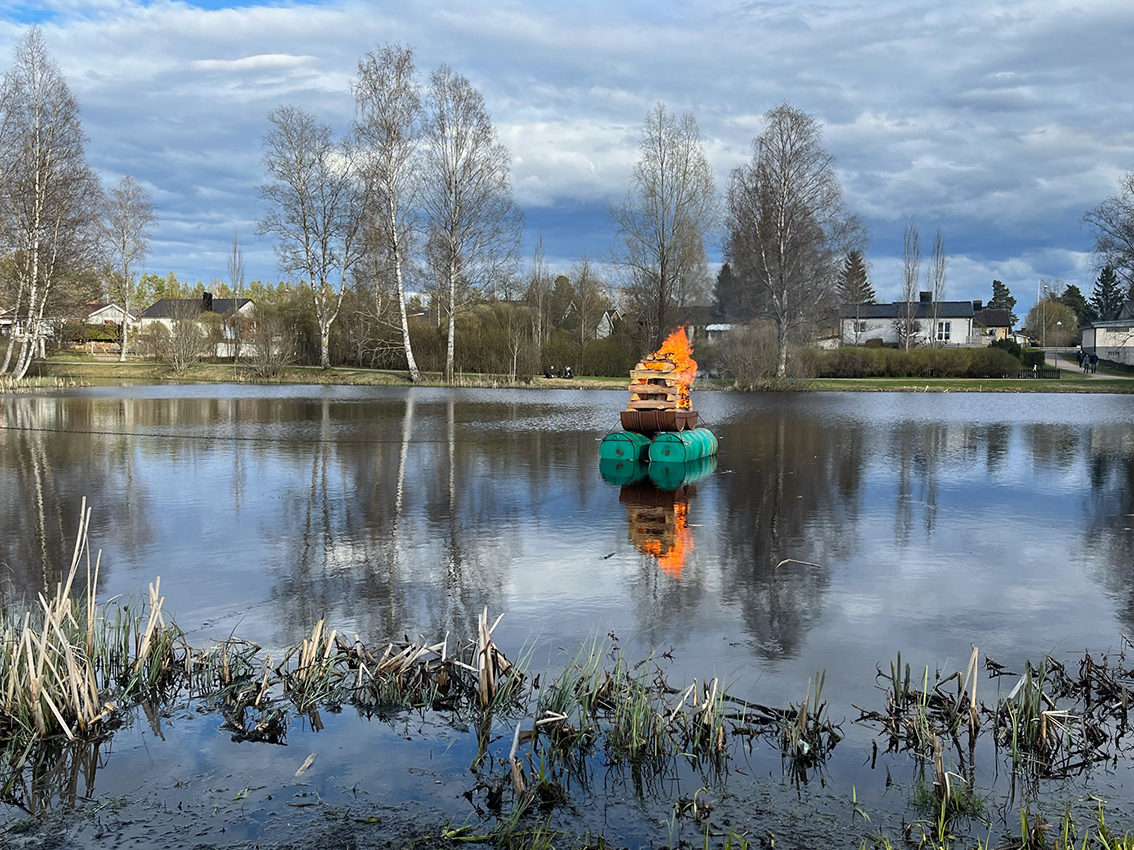 Valborgsmässoeld på en flotte i Linnarbäcken