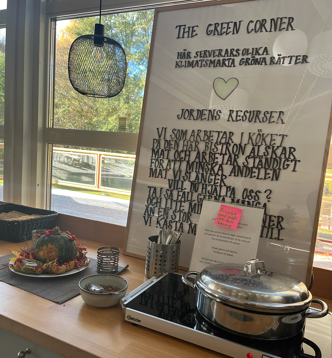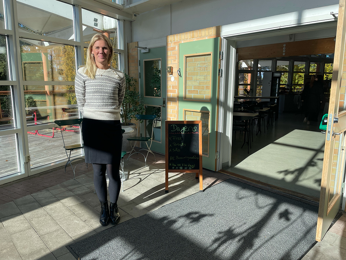 – För ett par år sedan gjordes matsalen om på Fenix kunskapscentrum i Vaggeryd för att bli mer trivsam med bistrokänsla. Vi köpte in nya möbler som ska passa för vuxna människor. Tallskog blev temat för inredningen, eftersom vi har en tallskog precis utanför. Vi inredde med olika möbelgrupper på olika sitthöjd, varma färger, textilier och varierande belysning. Vi köpte in fina uppläggningsfat till salladsbuffén och snygga grytor att variera kantinerna med, för att väcka nyfikenhet på maten. Matsalen bytte namn till Bistro och blev ett rum som fungerar för socialt häng, fika och andra aktiviteter under skoldagen. Vi flyttade också in skolkaféet i Bistron. Vi bestämde oss för ”att gå från matsal till restaurang”. Vårt mål var att sätta matgästen i centrum och skapa en varm och inbjudande måltidsmiljö. Vi vill att skolrestaurangen ska vara en plats att längta till och att fler elever kommer och äter den goda lunchen. Genom en bättre måltidsmiljö vill vi också öka yrkesstoltheten hos våra medarbetare och spegla hur mycket hjärta, förtroende och respekt för matgästen vi har.