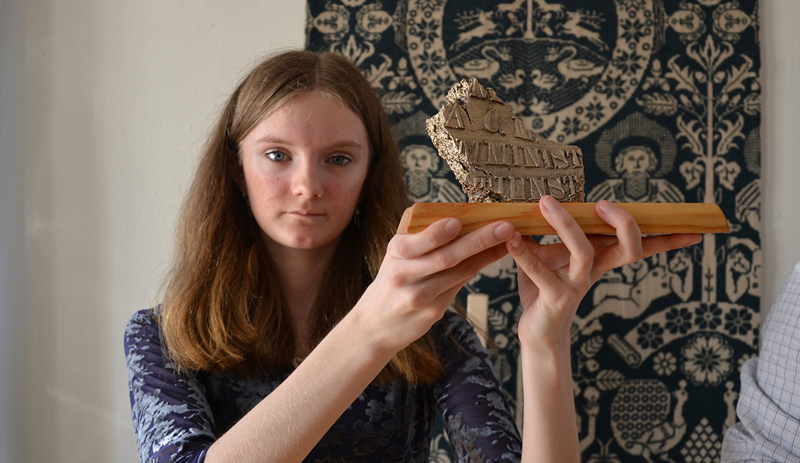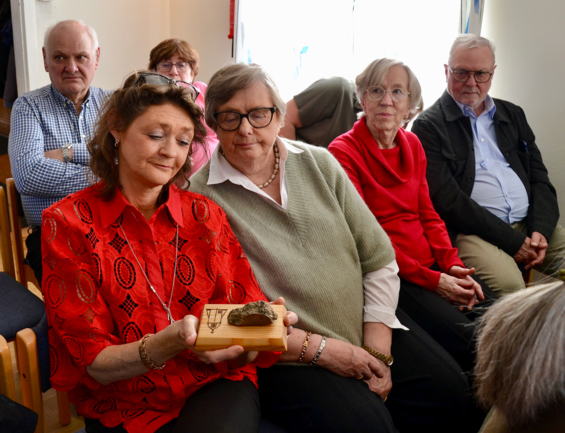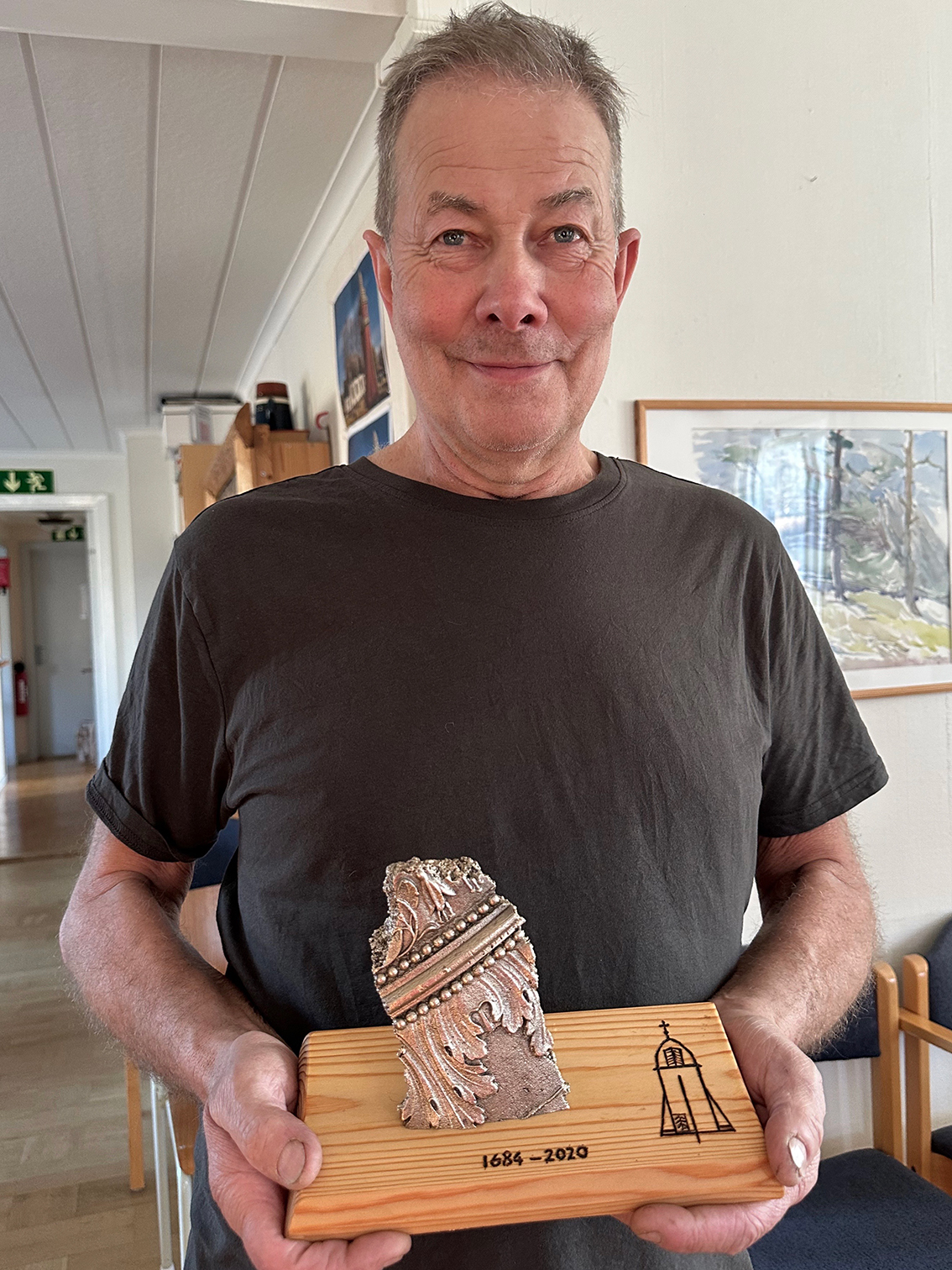 Lars-Henrik Olsson i Packebo kunde stilla vår nyfikenhet. Som ni alla vet så har vår gamla klockstapel varit utsatt för en tragisk brand för snart fem år sedan. Där i resterna grävde arkeologen fram småbitar efter klockorna som totalförstörda. De resterna togs tillvara och klockgjutaren i Ystad har gjutit en ny lillklocka. Men det blev lite rester över och bland dem såg Lars-Henrik ut några med mönster på. Därefter tog han fram putstrasan och från att varit ett förkolnat stycke skrot, så blev det en skinande fint minnesmärke över klockstapeln. Den blev uppsatt på en brädbit från klockstapeln med inskriptionen 1684-2020.
