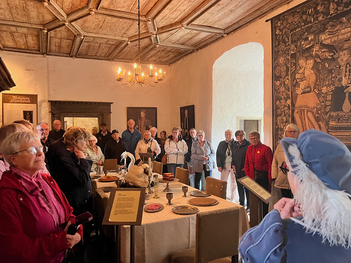 Redan i Bondstorp klev Gustav Vasa (!) ombord på bussen och lämnade den första ledtråden till vart vi var på väg. Sedan fortsatte färden med fler ledtrådar, fniss och gissningar – ända tills vi rullade in vid dagens mål: det storslagna och historiefyllda Torpa stenhus.