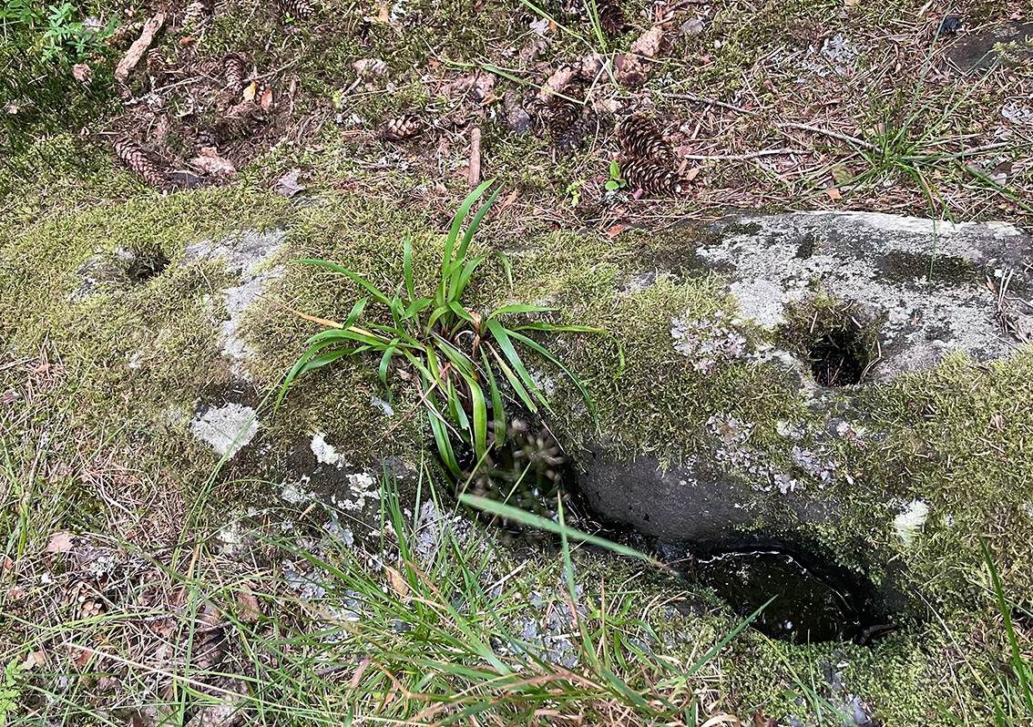 Fotavtrycket från en jätte som en gång stampade ner här. Kvar finns fotspåret och två håligheter från jättens stavar. Alltid vattenfyllda, och med magiskt vatten. Bild: Jenny Almlöf