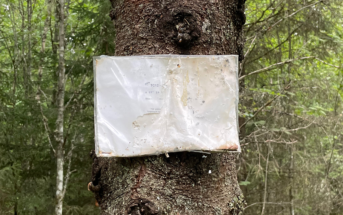 En bit in i skogen, alldeles invid gång- och ridvägen och i närheten av friluftsgården i Vaggeryd hänger en lapp på en granstam.