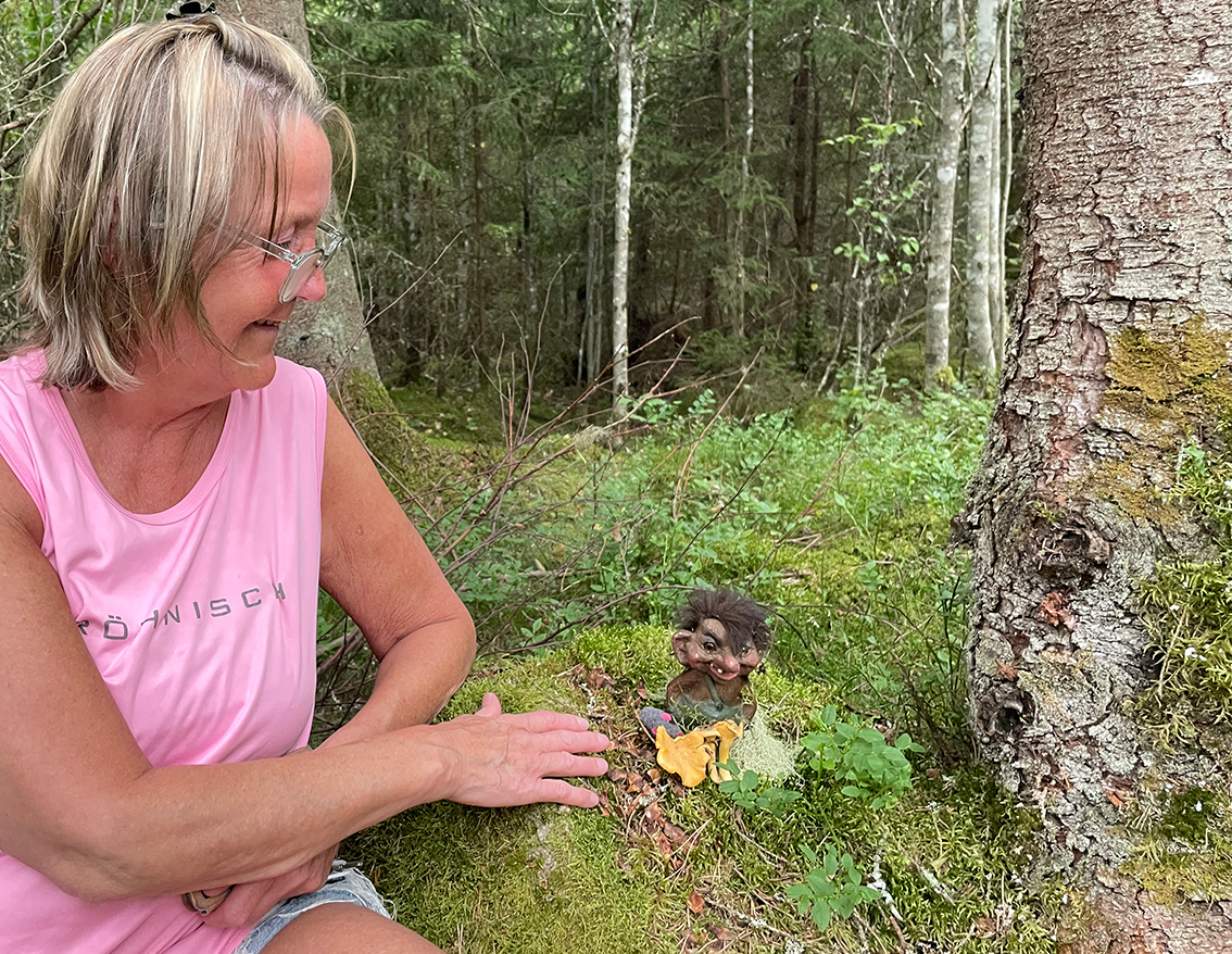 – Ja, jag köpte det här trollet och tyckte att det skulle stå här, vara här vid jättens fotavtryck. Och det är ju roligt för barnen, för fantasin. Troll betyder mycket. Jag har troll hemma, jag har troll i trädgården och jag älskar trollskogen. Trollet får vakta den här platsen så länge, säger Karin Melander.