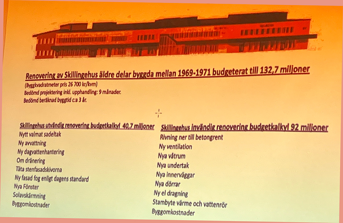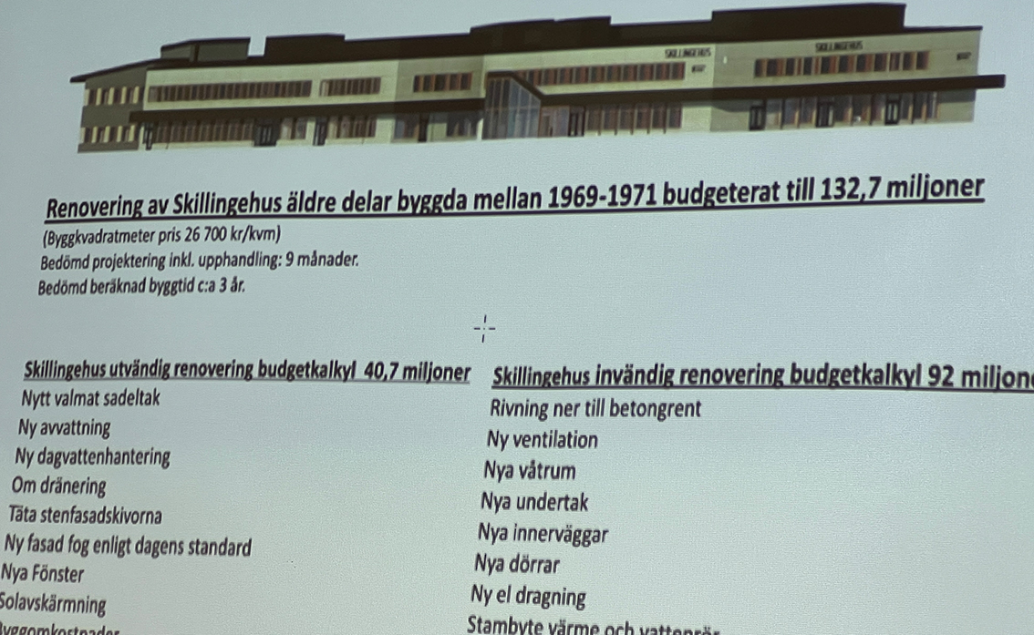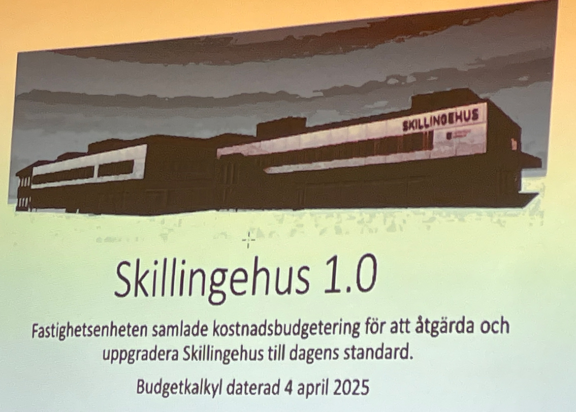 Det finns en utredning för renovering av Skillingehus och den slutar på 145 miljoner kronor. Källardelen med teatersalong, bowlinghall med mera behöver inte åtgärdas då dessa är i bra skick och har ett uppskattat värde av 100 miljoner kronor.