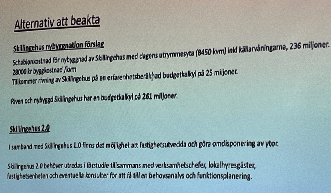 Andra noterade att det är viktigt att man arbetar för att nya Skillingehus blir en lokal som kan användas även efter kontorstid och att det blir samlingslokaler för invånarna.