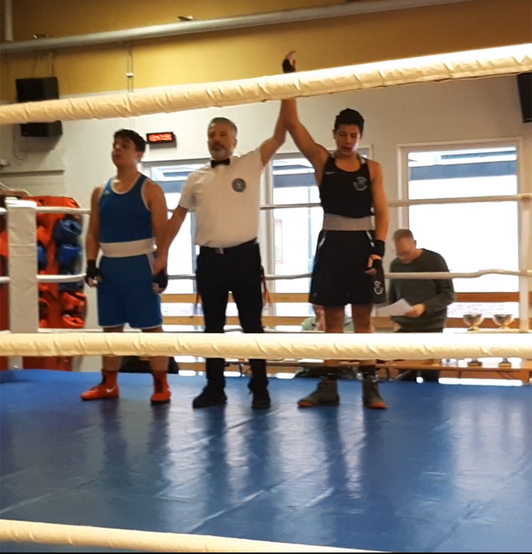 Erik Lundström avslutade med match mot en en kille från Ljungby några viktklasser upp från hans egen. Erik boxade alla tre ronder mycket fint med klart fokus och vann guldmedaljen mycket välförtjänt.