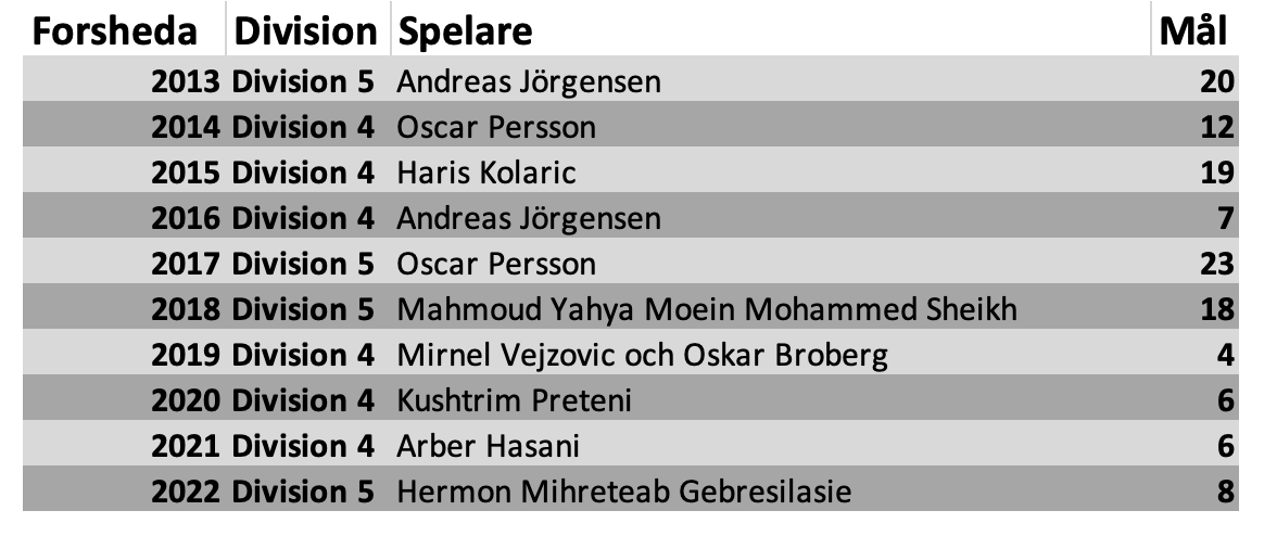 Fotbollen på lägre nivå har tagit sommarledigt. Men det innebär inte att det är tomt på fotboll i våra förråd. Nedan kan ni ta del av de tio senaste årens skyttekungar i Forsheda.