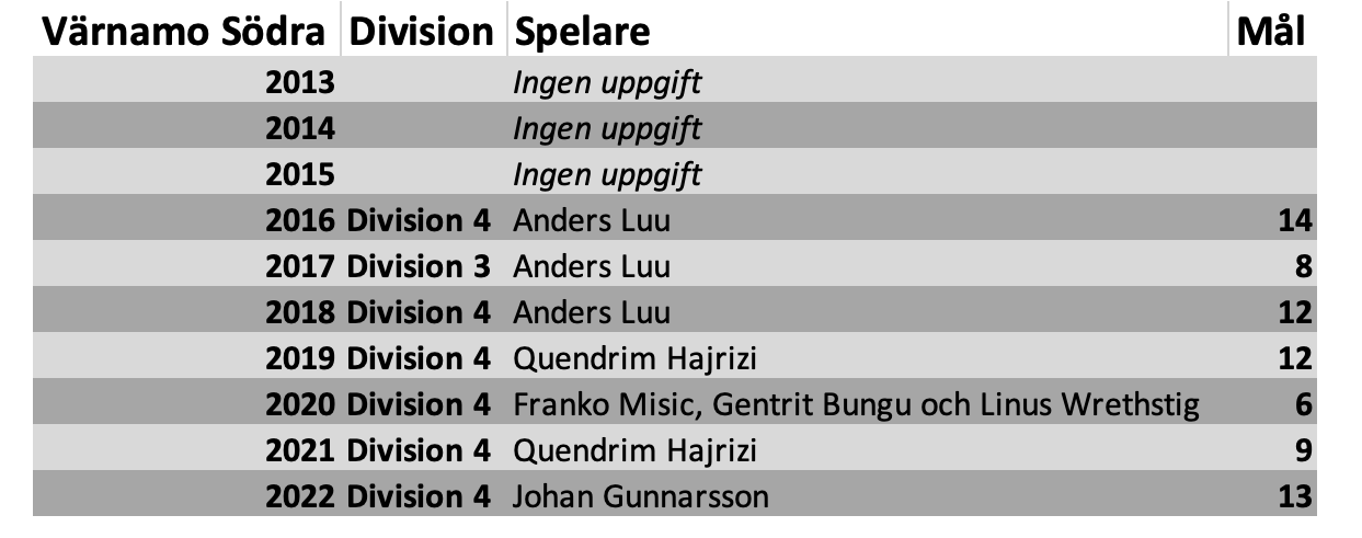 Fotbollen på lägre nivå har tagit sommarledigt. Men det innebär inte att det är tomt på fotboll i våra förråd. Nedan kan ni ta del av de tio senaste årens skyttekungar i Värnamo Södra.