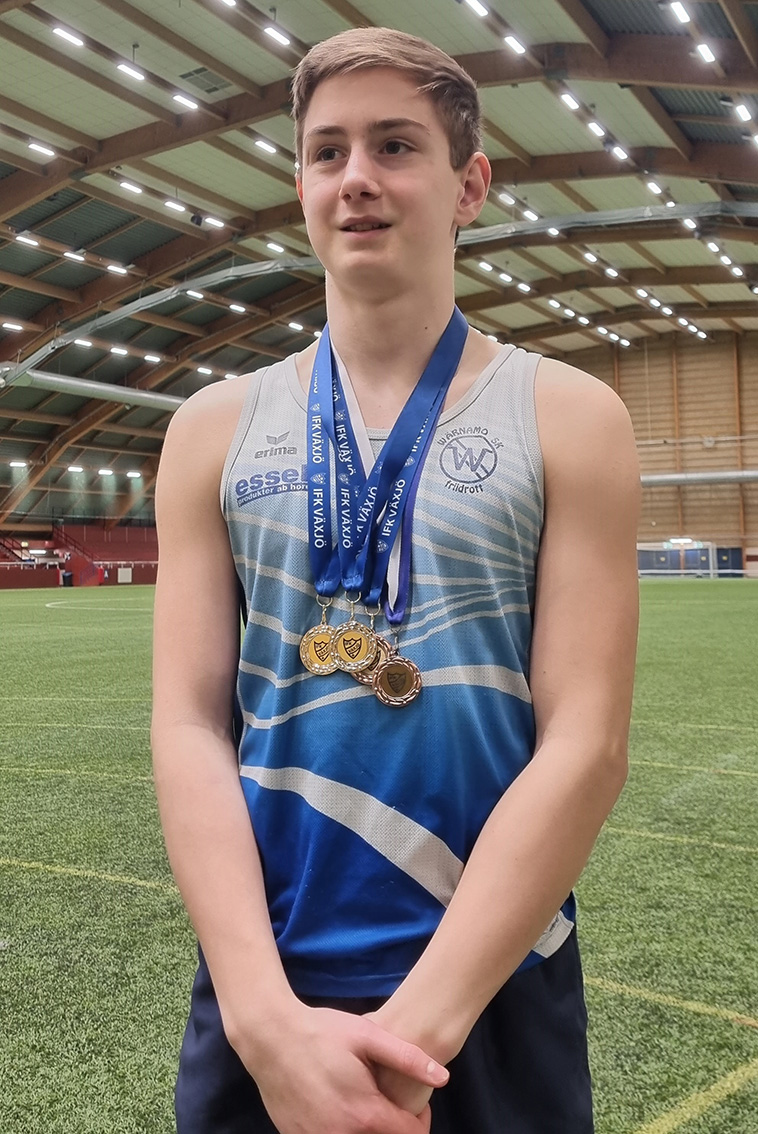 Jonathan Rinman, som är 14 år, tävlade i P15-klassen i Växjö inomhuskast och stod för fantastiskt fina insatser i alla grenarna som han körde. I vikt blev det guld med en segermarginal på cirka 3 meter när Jonathan kastade 14.14, ett resultat som tar upp honom som Sverige tvåa i sin åldersklass, P14. Även i diskus blev det guld och en stor segermarginal där det längsta kastet mätte 46.07. I kula knep Jonathan bronset med en stöt på 12.15, vilket tar upp honom som trea i Sverige statistiken i sin åldersklass. I spjut slog Jonathan till med sitt fjärde personliga rekord för dagen när han kastade 38.93.