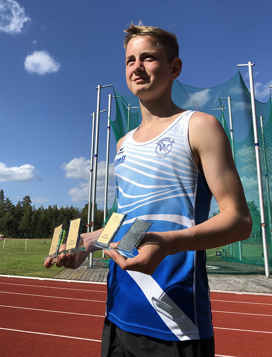 Jonathan Rinman som tävlar i p 13-klassen gjorde återigen en fantastiskt fin tävling i Habo med den mycket fina resultatraden: Höjd 1:a 1.40, Kula 2:a 9.22, diskus 1:a 31.42 och spjut 1:a 37.66 och nytt personligt rekord.