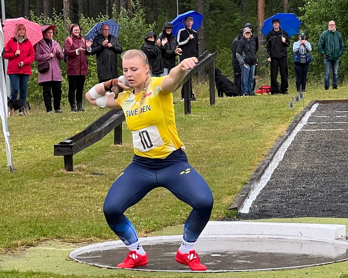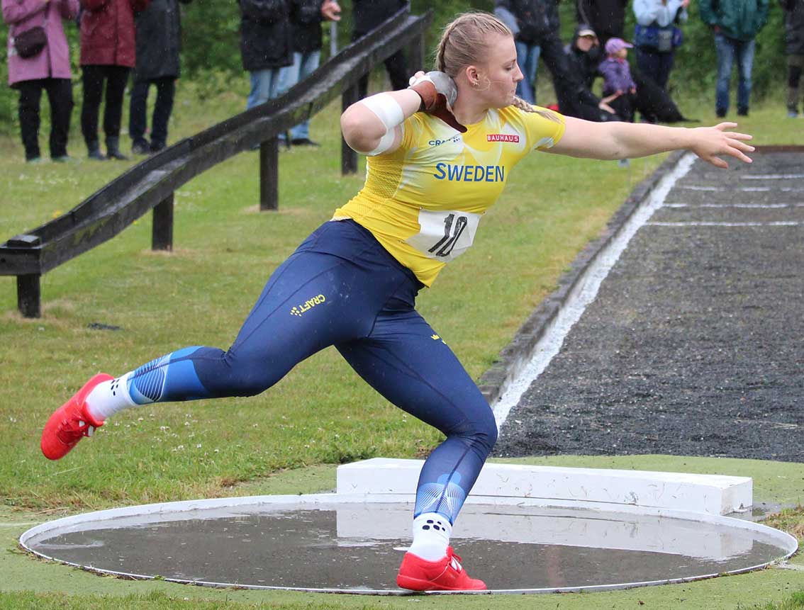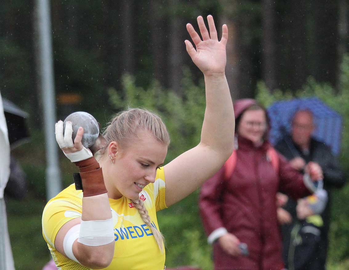 Den svenska rekordhållaren i kulstötning tangerade sitt årsbästa från Bottnaraydskastet för bara några dagar sedan. Noteringen blev 18,97 och trogna guldvinnaren Fanny Roos från Ryssby utanför Ljungby fick näja sig med silver. Fanny fick till en mycket bra sistastöt med 18,,57 men rådde inte på Axelina Johansson. Båda är karla för OS i Paris.