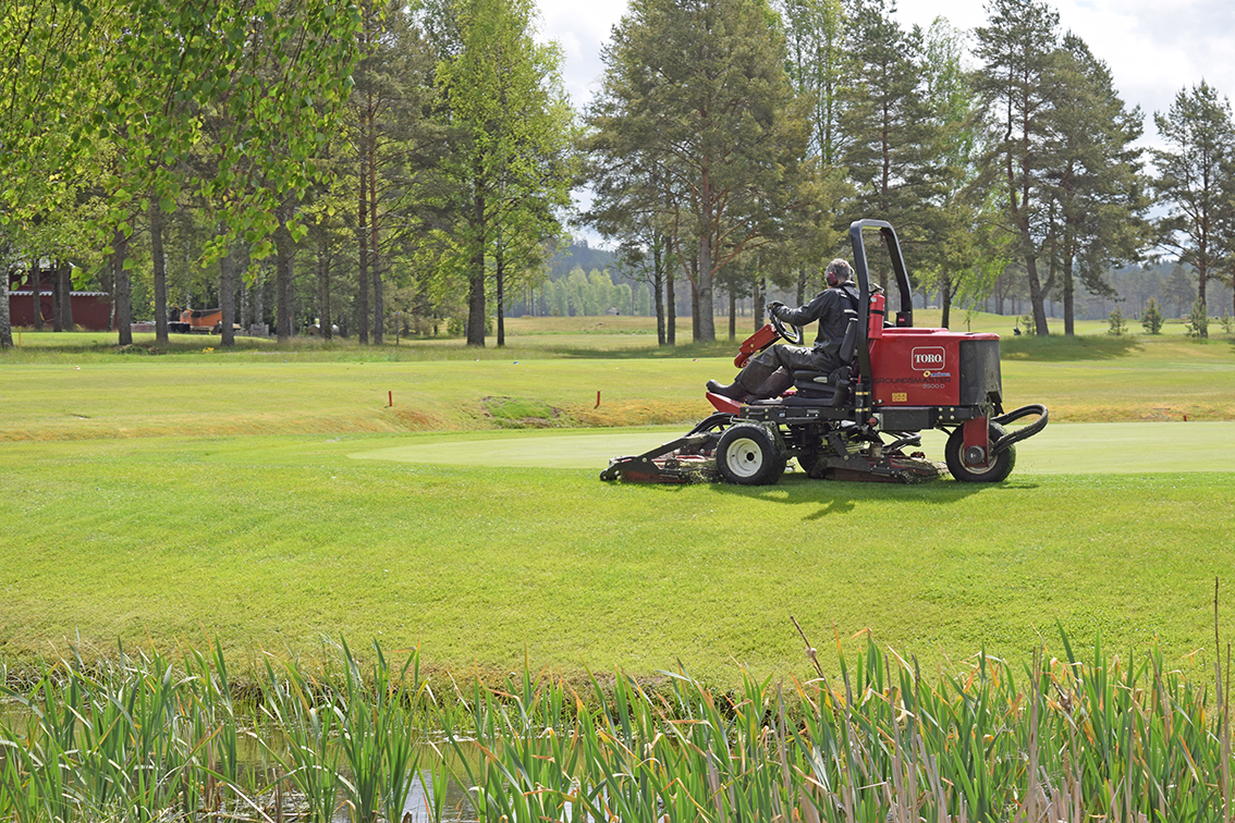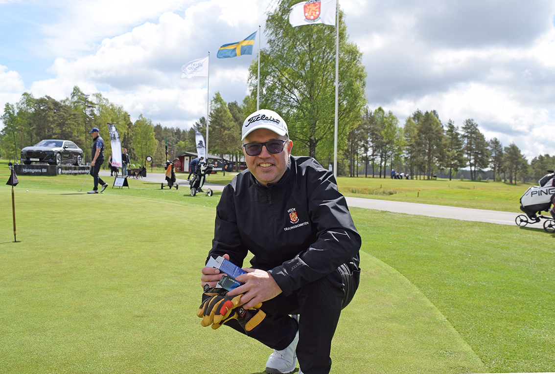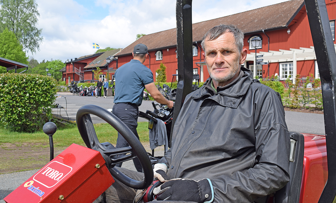 Innan vi lämnar golfbanan för den här gången sitter greenkeepern Thomas Johansson från Vaggeryd och väntar på att få köra ut med gräsklipparen. – Ja, jag väntar lite, vill inte störa spelarna. Det är 20 hektar gräsmatta som klipps i olika höjder, varje dag.