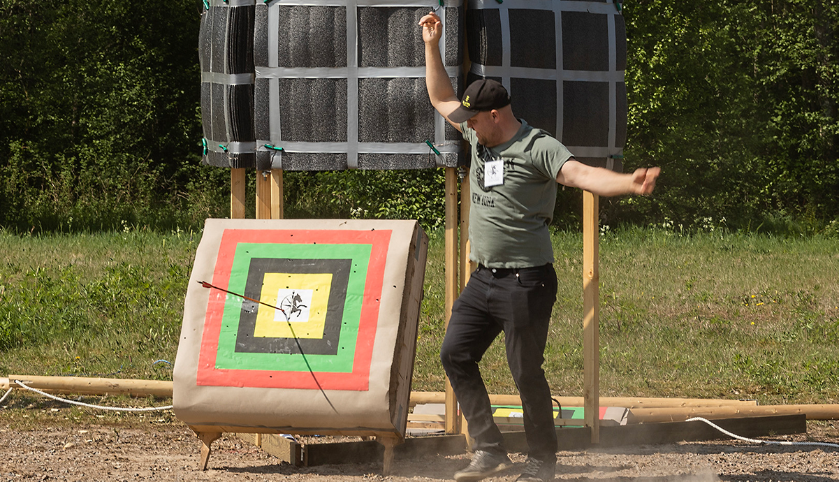 Ett tyst lugn lägger sig över den nyss svämmade marknadsplatsen och vi summerar helgens nationella tävling i beridet bågskytte "Sydsvenska Trähästen" som ägde rum på Vrigstad marknad. Tävlingen bestod av två grenar - "Raid" och "Tower" som i stort sett går ut på att ryttaren i full galopp ska skjuta ett visst antal pilar på några måltavlor på en 90 m rak bana och under en viss idealtid.